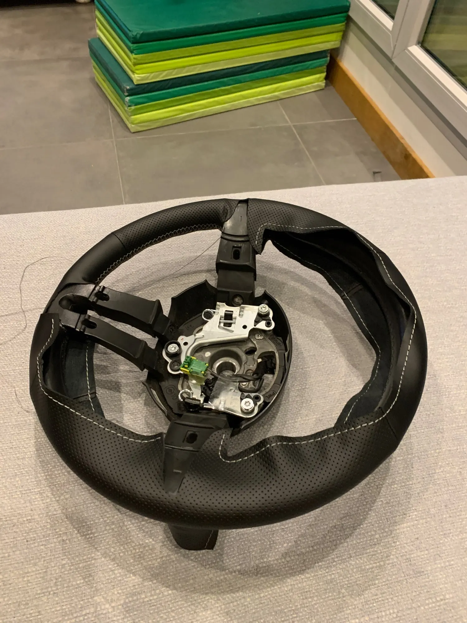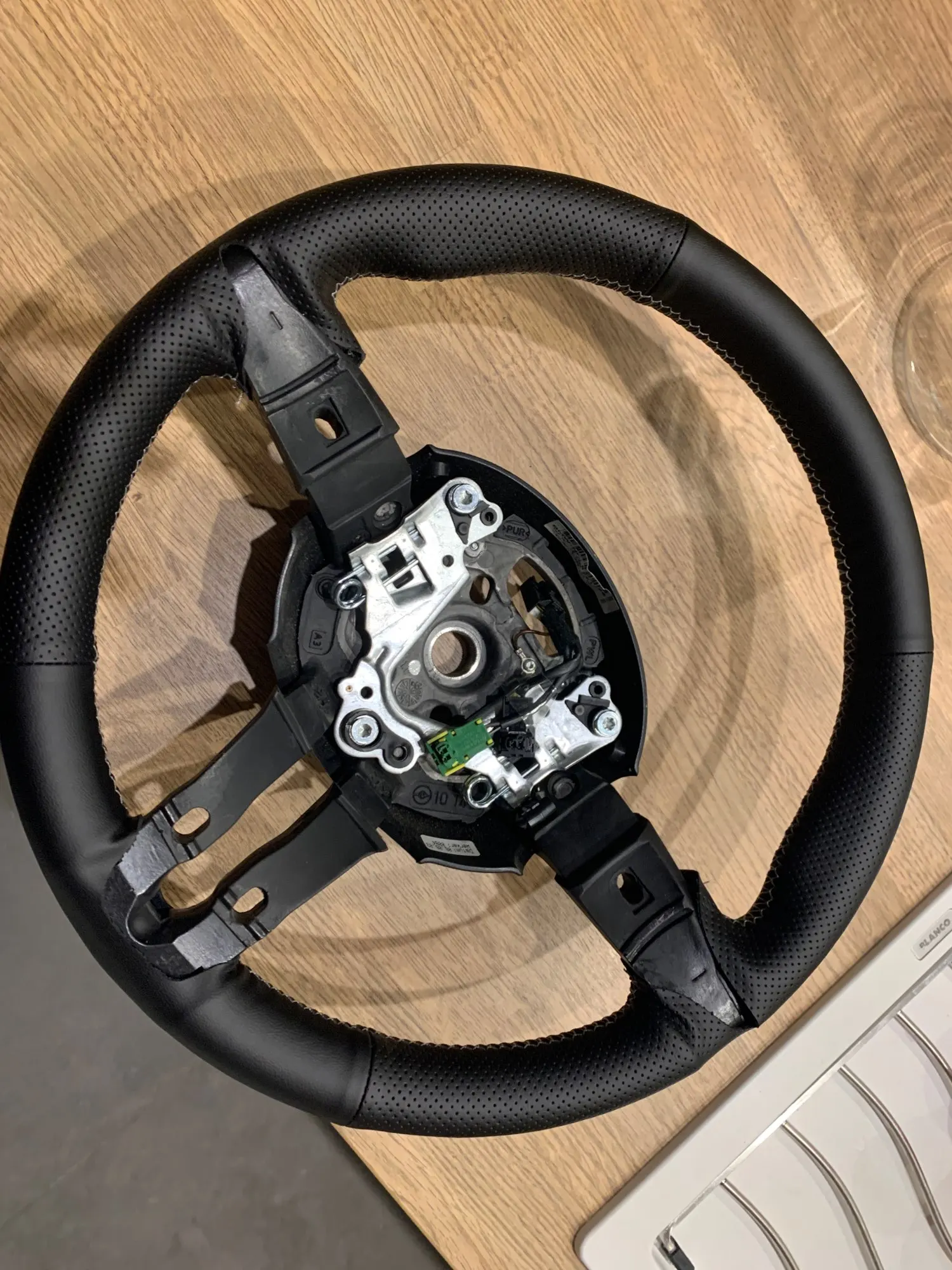 Хорошее качество и вес. Сбоку выглядит как сшитое новое рулевое колесо.