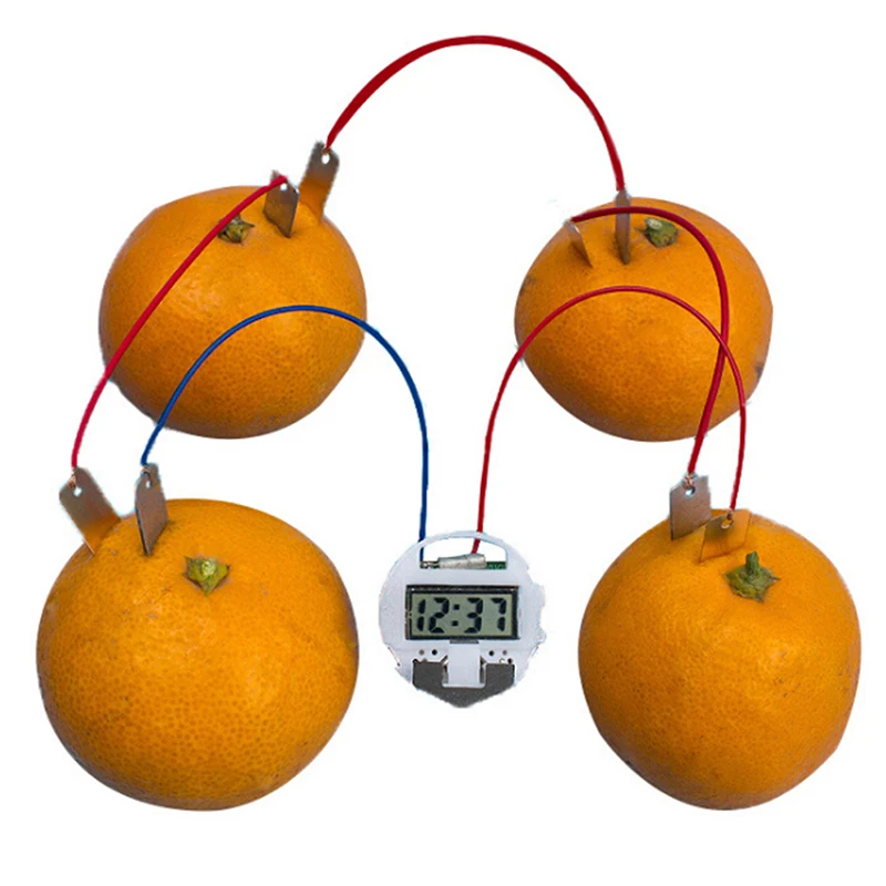 Как это работает:1. Металлические полоски и фрукты представляют собой простую батарею, которая создает электричество для работы часов. Каждый плод работает как устройство, называемое электрохимической клеткой. Преобразует химическую энергию, хранящуюся в металлических полосках, внутриэлектрическую энергию. Требуется четыре или два плода, чтобы сделать электричество достаточно сильным, чтобы работать с часами.2. Ячейка работает из-за химических свойств металлов внутри (в этом чехле медь и цинк). Различные свойства вызывают крошечные частицы, заряженные электричеством.(Называется ионами) для перемещения между двумя металлическими полосками. Этот поток-электрический ток. Плоды содержат частицы, которые пропускают ток, но останавливают соприкосновение металлов. Электрический ток также проходит по проводам между цинковыми и медными полосками и часами. Благодаря этому току часы работают.Примечание:* Из-за разницы светильник щении и экранах цвет изделия может немного отличаться от изображения.* Возможны отклонения на 0,5-1 см из-за ручного измерения.