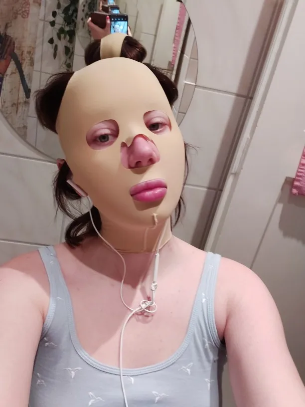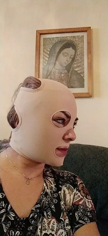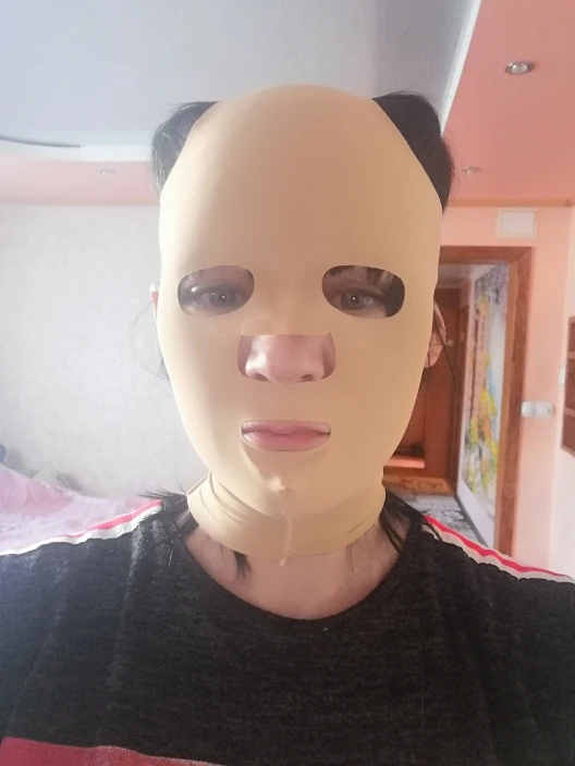 Маска очень хорошо держит лицо. Сшита качественно. Но туго в области шеи. Может у меня шея толстая а так все отлично. Хороший бандаж.
