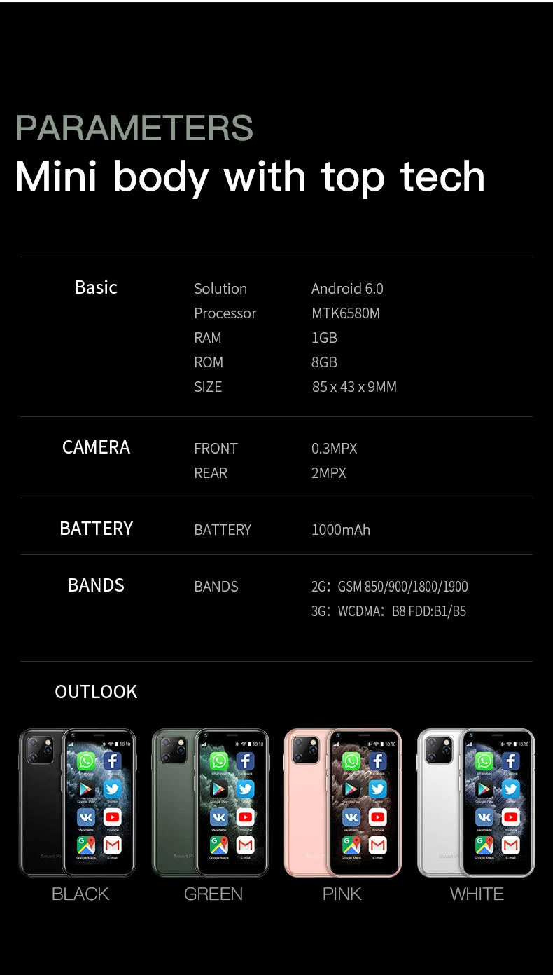 Смартфон SOYES XS11 Super Mini, 1 ГБ ОЗУ 8 Гб ПЗУ, экран 2,5 дюйма,...