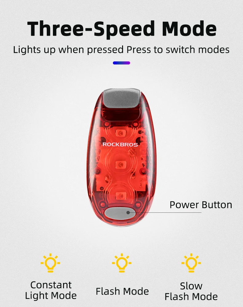 Бренд: ROCKBROSРежим: 3 режима яркий/вспышка/медленная вспышкаВес: около 20 гРазмеры: около 5,5*3*1,5 смХарактеристики: мини портативный, подходит для нескольких сценариев, предупреждение безопасности