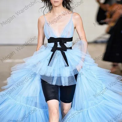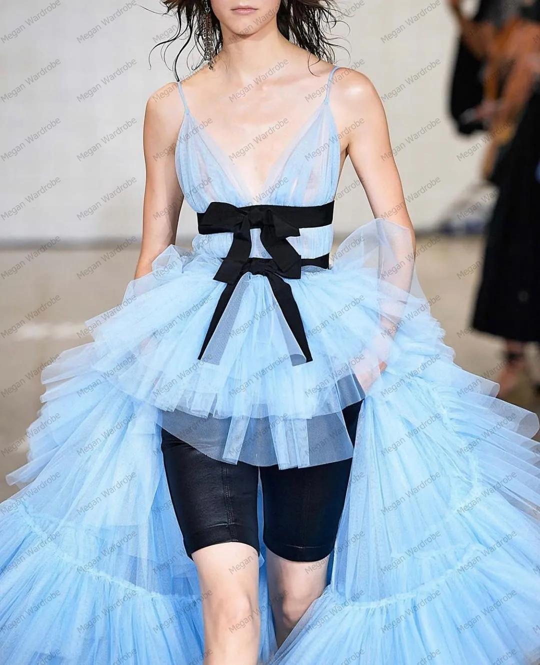 Шикарные Женские тюлевые платья небесно-голубого цвета, женское платье с глубоким V-образным вырезом на тонких бретельках, вечернее платье Teffeta