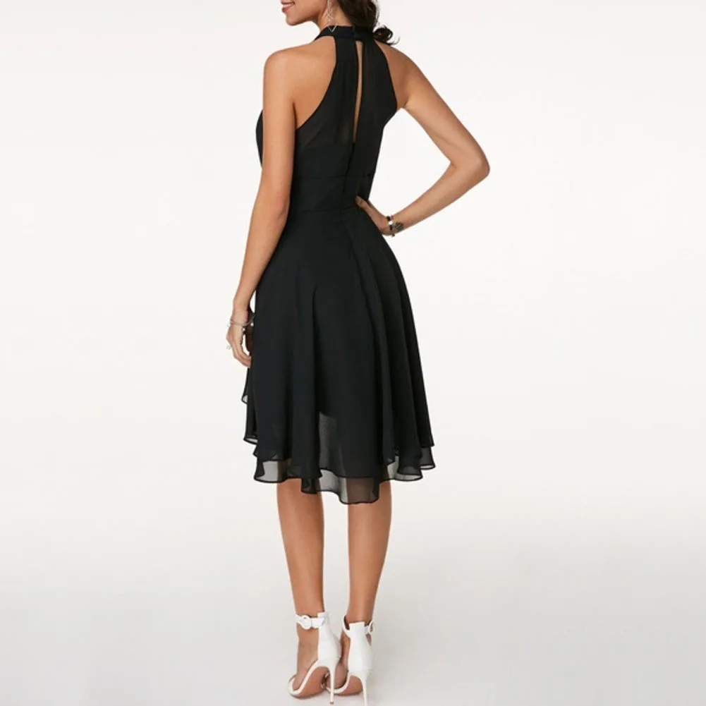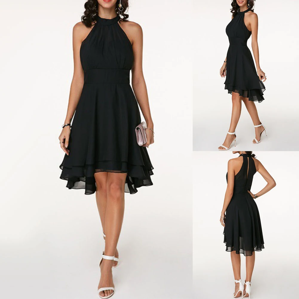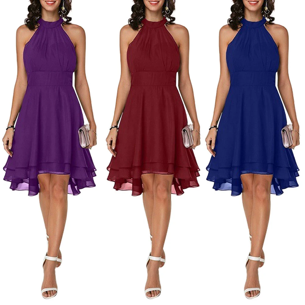 Летние Элегантные женские платья с высокой талией, сексуальные укороченные Многослойные однотонные платья с лямкой на шее, женские повседневные шифоновые вечерние платья без рукавов