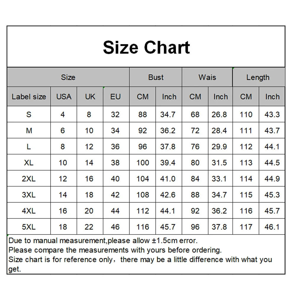 Информация о размере[Наш Размер S] Обхват груди: 88 см/34,7 дюйма, обхват талии: 68 см/26,8 дюйма, длина: 110 см/43,3 дюйма (прибл.)[Наш Размер M] Обхват груди: 92 см/36,2 дюйма, обхват талии: 72 см/28,4 дюйма, длина: 111 см/43,7 дюйма (прибл.)[Наш Размер L] Обхват груди: 96 см/37,8 дюйма, обхват талии: 76 см/29,9 дюйма, длина: 112 см/44,1 дюйма (прибл.)[Наш Размер XL] Обхват груди: 100 см/39,4 дюйма, обхват талии: 80 см/31,5 дюйма, длина: 113 см/44,5 дюйма (прибл.)[Наш Размер 2XL] Обхват груди: 104 см/41,0 дюйма, обхват талии: 84 см/33,1 дюйма, длина: 114 см/44,9 дюйма (прибл.)[Наш Размер 3XL] Обхват груди: 108 см/42,6 дюйма, обхват талии: 88 см/34,7 дюйма, длина: 115 см/45,3 дюйма (прибл.)[Наш Размер 4XL] Обхват груди: 112 см/44,1 дюйма, обхват талии: 92 см/36,2 дюйма, длина: 116 см/45,7 дюйма (прибл.)[Наш Размер 5XL] Обхват груди: 116 см/45,7 дюйма, обхват талии: 96 см/37,8 дюйма, длина: 117 см/46,1 дюйма (прибл.)Примечания:Пожалуйста, обратитесь к нашей таблице размеров и выберите правильный размер.Благодаря светильник и экрана Цвет Товара может быть s светильник ly отличается из-за характеристик монитора компьютера.Посылка включает в себя: (другие не включены)1 платье
