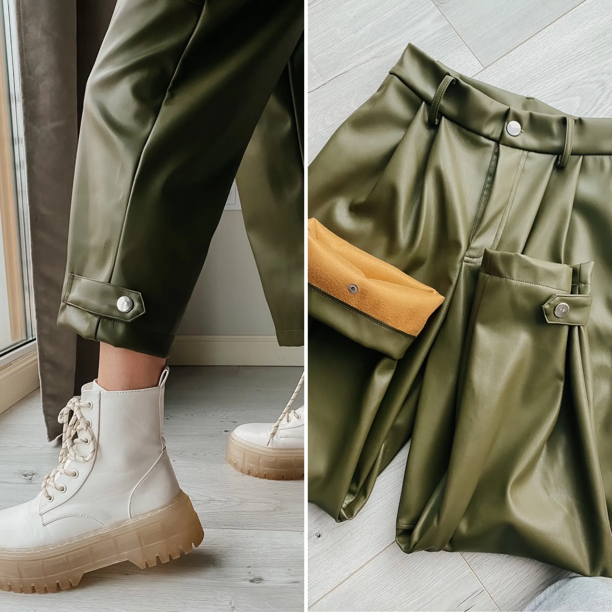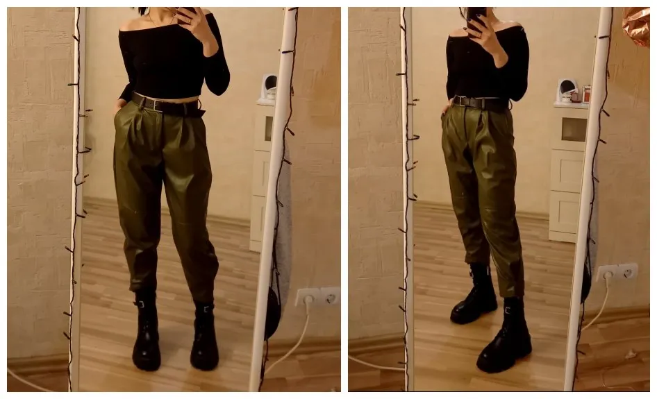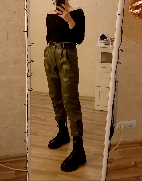Мой инстаграм @juliakhara Брюки из кож зама. Очень качественные и стильные! Цвет красивый! Внутри подкладка - приятная к телу. Фасон очень крутой. На мои параметры: рост 162, 84-64-90 сели отлично. Не большие и не в обтяжку. На щиколотке 2 кнопки - можно носить ровными, можно перестегнуть кнопку и будет зауженный крой. Доставка в Москву недели за 2,5 Однозначно рекомендую