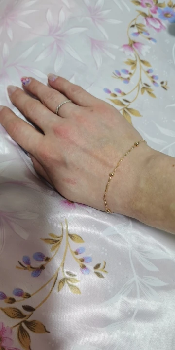 браслет на запястье, выглядит симпатично, блестит новизной.