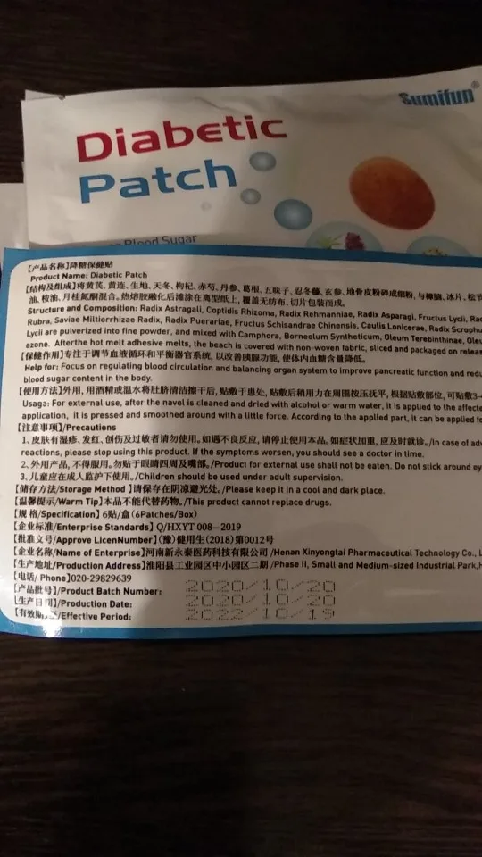 100% Аутентичный, работает быстро, хорошая эффективность. Этот продукт очень известен в Китае как Адъювантная терапия. Эффективен в обработке без побочного эффекта. Настоятельно рекомендую.Пластырь для здоровья диабетиков. Его уникальность позволяет проникать через кожу необходимые агенты в кровеносные сосуды.Прямая поставка в крови вводит необходимые вещества в систему кровообращения, которые в свою очередь снижают уровень сахара.Пронизывая все части тела, они достигают тех, кто нуждается в исцелении. Диабетическая пластырь влияет на тело через область пупка.Растительные экстракты включены в пластырь, мягко помогая с правильной дозировкой для нормализации уровня сахара в крови. Пластырь для диабетиков предназначен для лечения локализованных периферийных устройств для диабетиков, способствует облегчению симптомов диабетической невропатии, таких как глубокая боль, одышка, плохая память, частое мочеиспускание, онемение и боль в конечностях.Штукатурка для сахара в крови (диабетик)Примечание: после использования диабетической пластыри, если вы принимаете другие химические препараты, пожалуйста, не останавливайте это, пожалуйста, измеряйте сахар в крови каждый день и записывайте его. 80% пациентов, после использования через 2 -3 недели, уровень сахара в крови будет уменьшен, затем медленно Уменьшите химическую медицину, шаг за шагом. Наконец, может наконец остановить другие лекарства.Травяное лечение диабета будет сосредоточено на регулировании циркуляции крови и Ци и балансировании системы органов для улучшения функции поджелудочной системы и устранения внутреннего тепла и истощения жидкостей.Использование:1. Только внешнее использование2. Промойте область пупка теплой водой, откройте мешок и выньте пластырь, наклейте его на пупок,3. Один патч используется для 3-4 дней. Затем удалите его и очистите кожу.4,5 штук в качестве отдельного курса лечения. 2-3 процедуры (10-15 пластырей) предлагаются для достижения наилучшего результата.Спецификация: 2 г/шт./сумка из фольгиПротивопоказание: поврежденная кожа и аллергия, дети, беременные и кормящие женщины.Хранение: Хранить в прохладном и сухом месте.Срок годности: 2 года