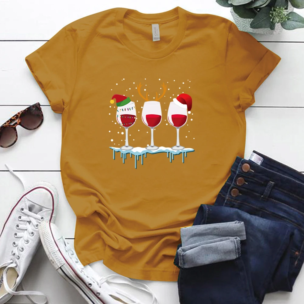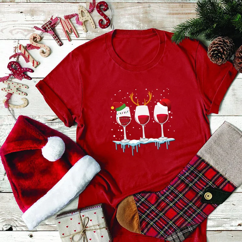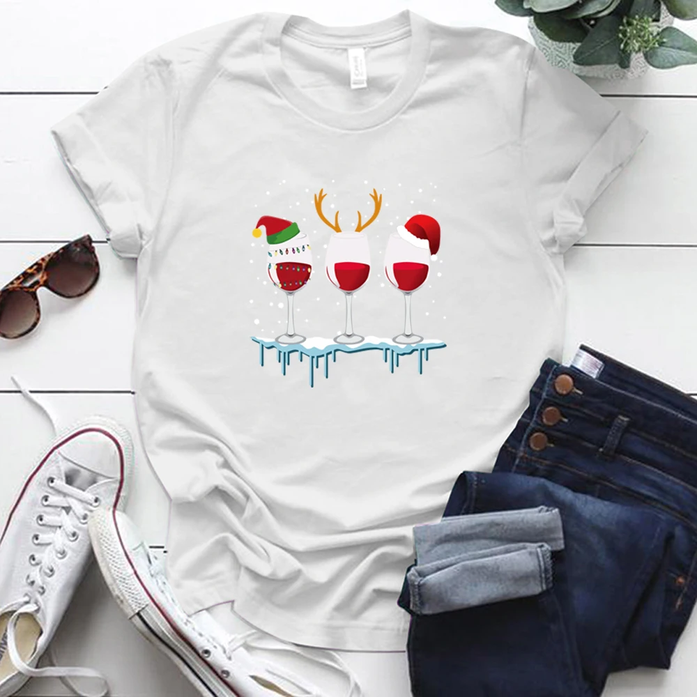 Рождественский бокал для вина, Рождественская Футболка с принтом Санта-Клауса Харадзюку, свободная футболка с круглым вырезом, топы, праздничная футболка, Mujer Camisetas