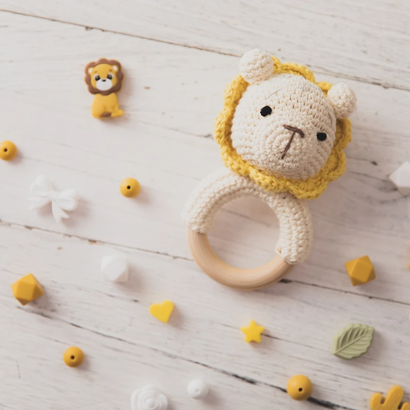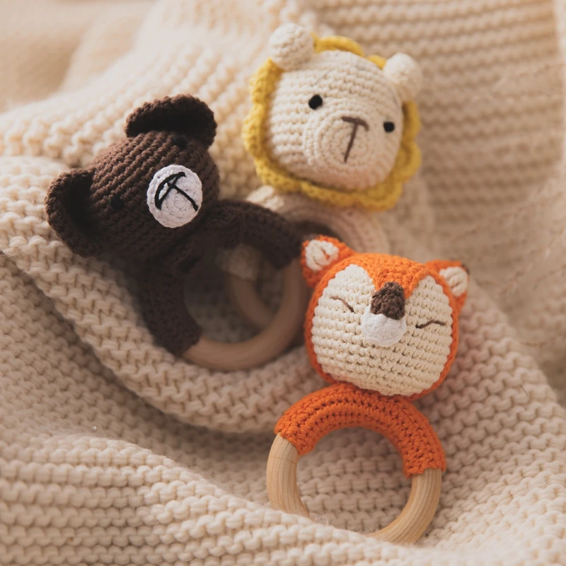 1 шт. детский прорезыватель BPA бесплатно, связанная крючком погремушка, игрушки с мультяшным животным львом лисой, деревянное буковое кольцо, пустышка для кормления, развивающие игрушки