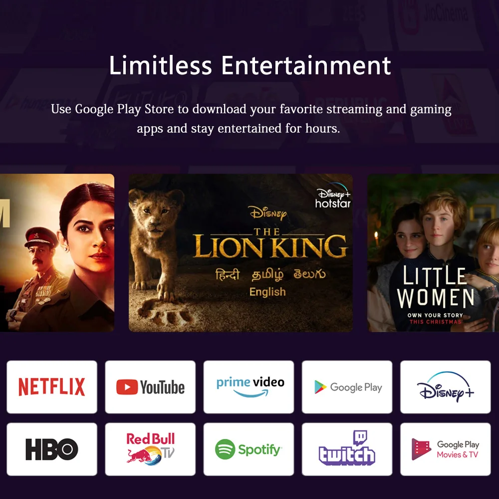 Используйте Google Play Store, чтобы загрузить ваши любимые потоковые и игровые приложения и развлекаться часами. Предварительная установка Netflix И Prime video для быстрого доступа с одной кнопкой.