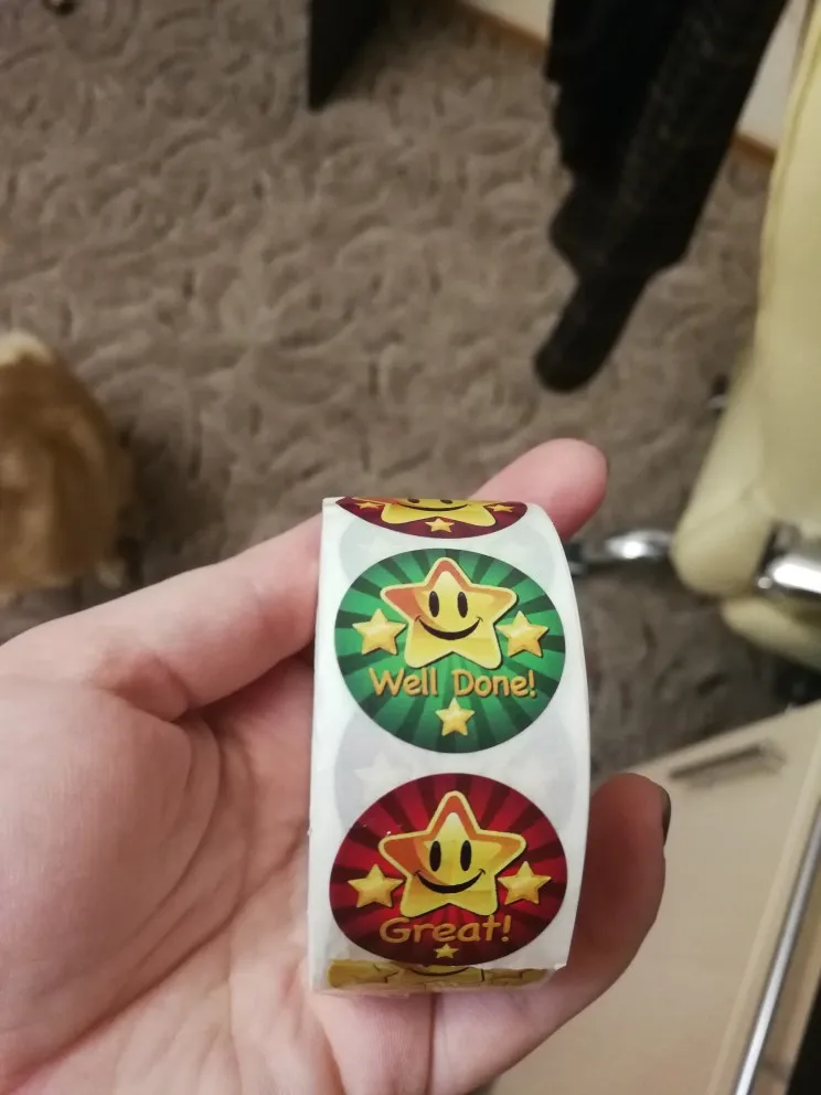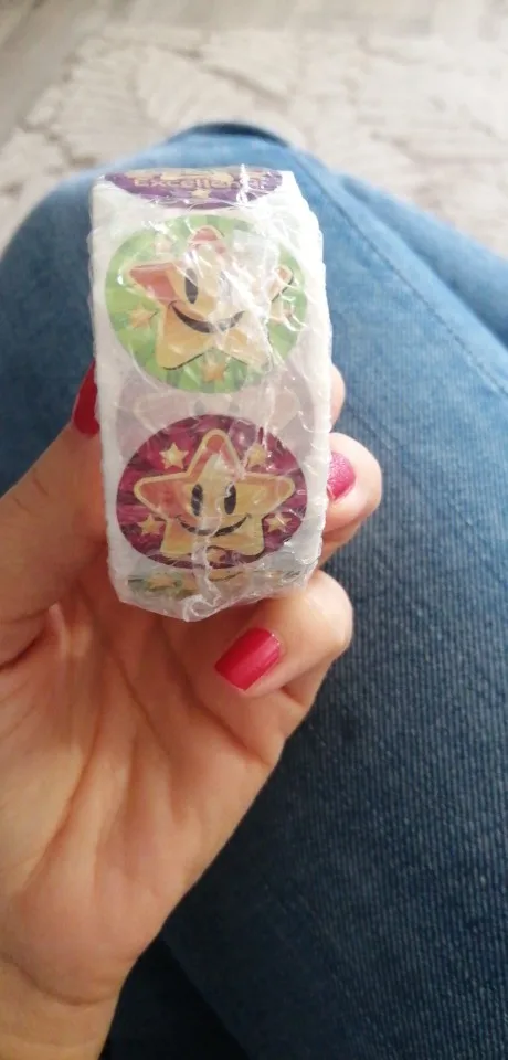 Очень красочные наклейки со звездами, которые очень хорошо прилипают. Я рекомендую их. Они поставляются в рулоне (как показано на фотографиях) герметично, поэтому все они очень хорошо защищены.