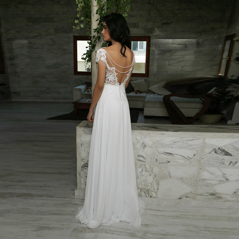 Шифоновое свадебное платье с жемчужными цепочками и V-образным вырезом