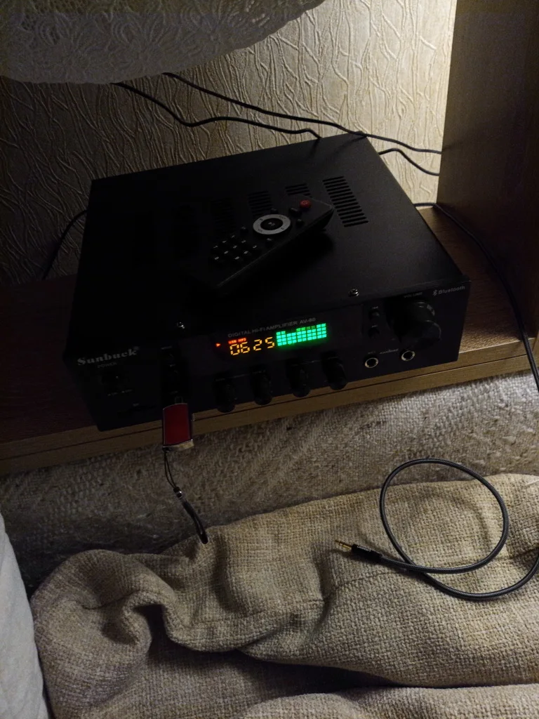 Проверял со старыми 3-х полосными 6 Ом колонками Sony от муз. центра. Звук громкий, до максимума не смог выкрутить громкость, боюсь соседи не обрадуются. :) Большой диапазон регулировки тембра низких и высоких частот. Нюанс: при подключенном штекере переднего разъёма AUX, звук с заднего входа не идёт. Регулировка громкости с пульта и ручкой на аппарате - независимая. Т.е. ручкой задаём максимум громкости и до него можно будет пультом выкручивать 0-30 ед. по экрану. FM-радио. При поиске передач нашлись и запомнились 42 штуки во всём диапазоне. Причём приём хороший даже на не сильно расправленный проводок антенны, лежащий на столе. По Bluetooth так же всё работает. Только микрофоны не проверял. Не пользуюсь ими. Ещё не понял как работает визуальный эквалайзер при проигрывании музыки. На экране то просто все полоски по горизонтали в два ряда ползают вверх-вниз, то эквалайзер делает вид что работает и как то пытается отобразить уровни сигнала в такт музыки.