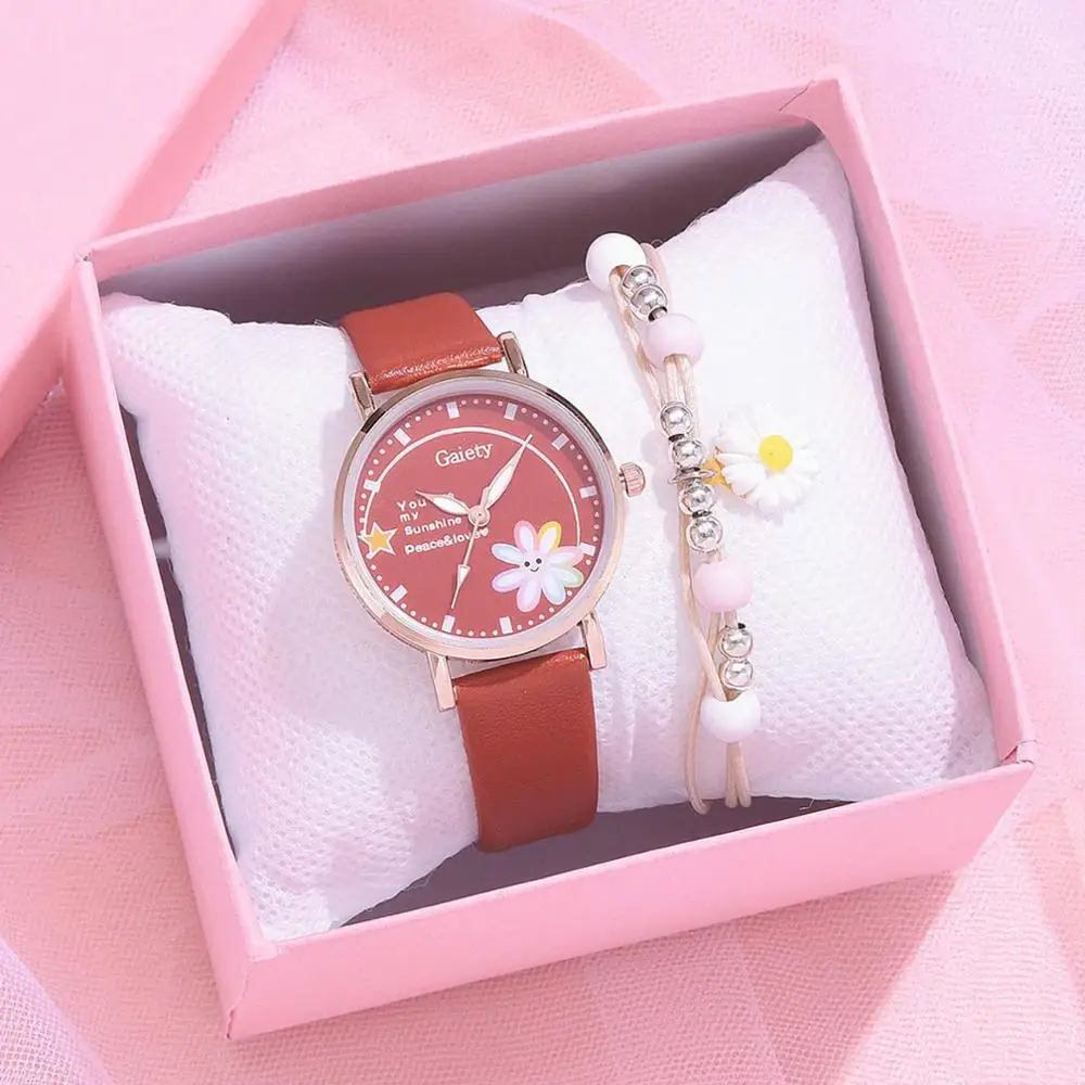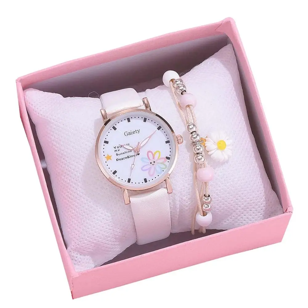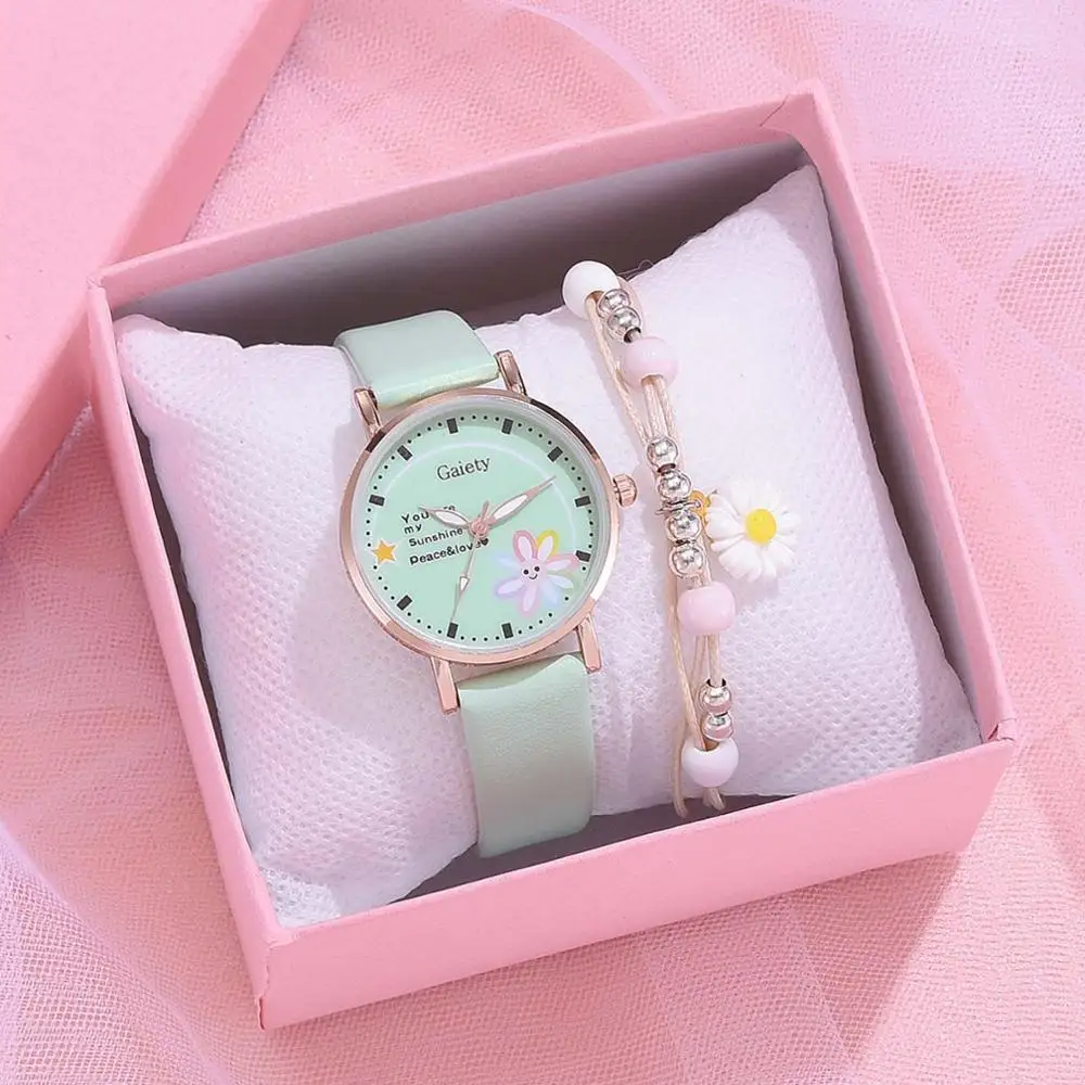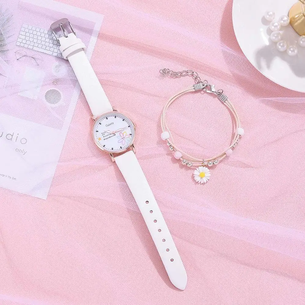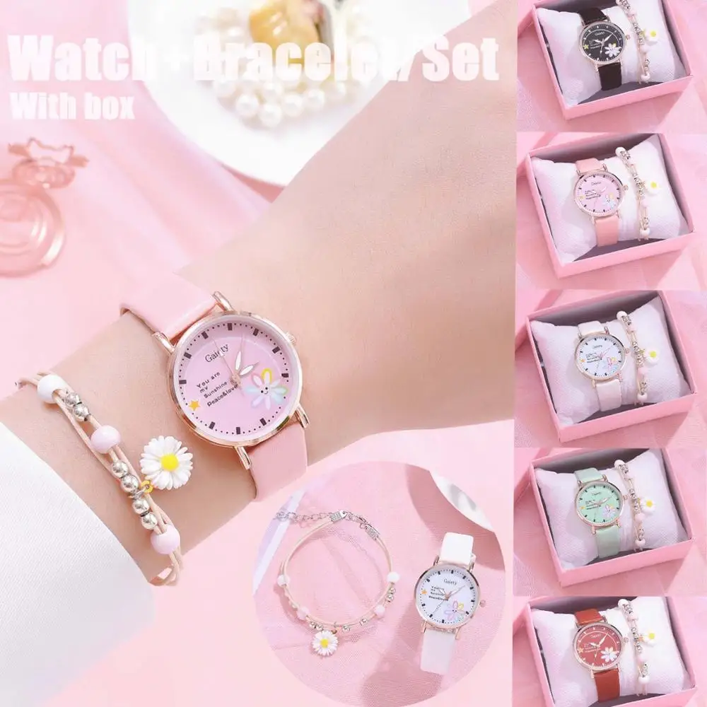Роскошный модный кожаный ремень Макарон с мультяшными часами и браслетом в виде Маргаритки