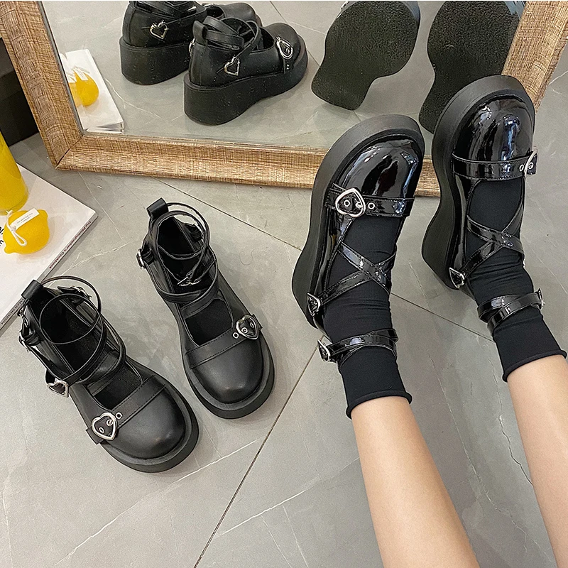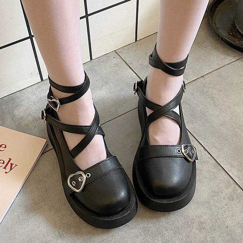 Обувь в стиле Лолиты; Обувь на платформе с перекрестной шнуровкой; Пряжка в форме сердца Повседневная обувь; Обувь для девочек на толстой подошве в стиле панк; Женская обувь с ремешком на щиколотке; 8830N