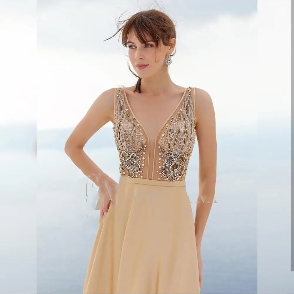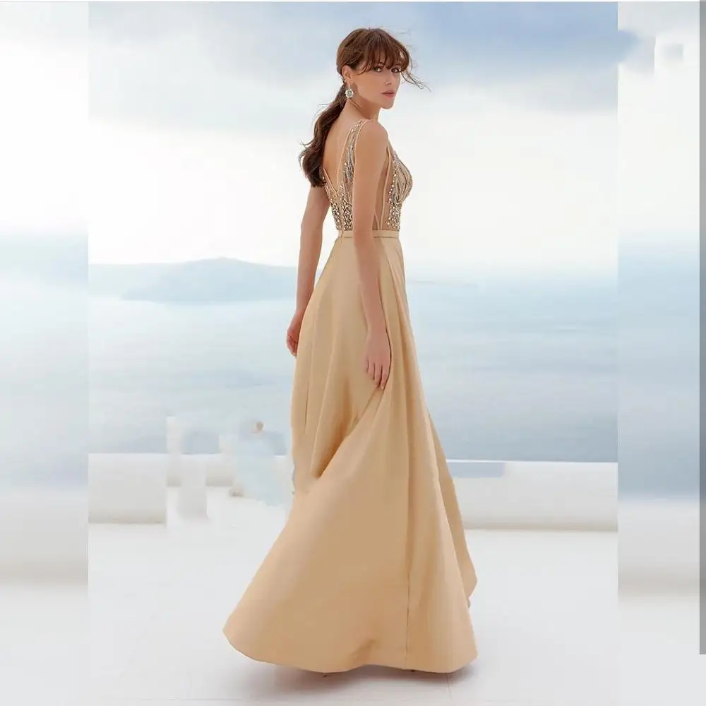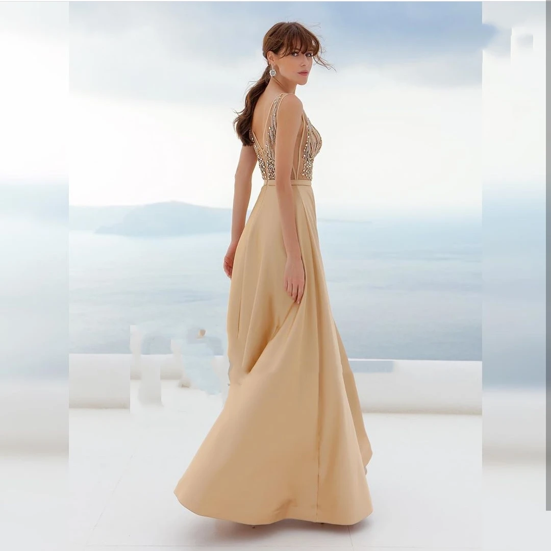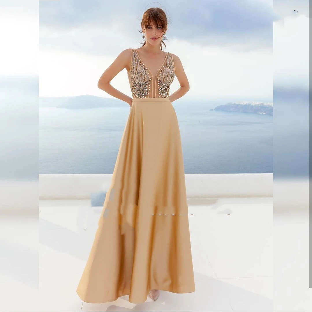 Вечернее платье Шампань 2020 Сексуальная v-образным вырезом Спагетти ремень с открытой спиной длиной до пола атласные элегантные хрустальные бисером выпускного вечера специальные вечерние
