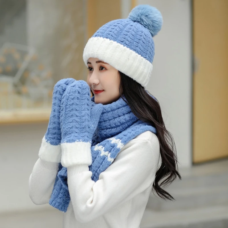 Зимняя вязаная шапка с помпоном, длинный шарф, перчатки, набор для женщин, контрастные цвета, вязаные, с плюшевой подкладкой, шапка с черепом, ветрозащитные теплые варежки с воротником