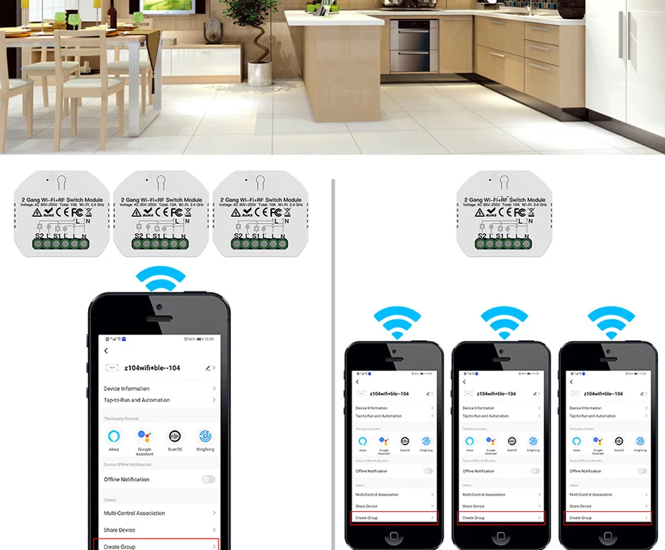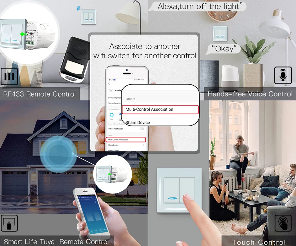 2 способа управленияДва переключателя управления один светильникМногоконтрольная связь переключателя на другой смарт-коммутатор wifi в приложении для реализации управления 2 способами