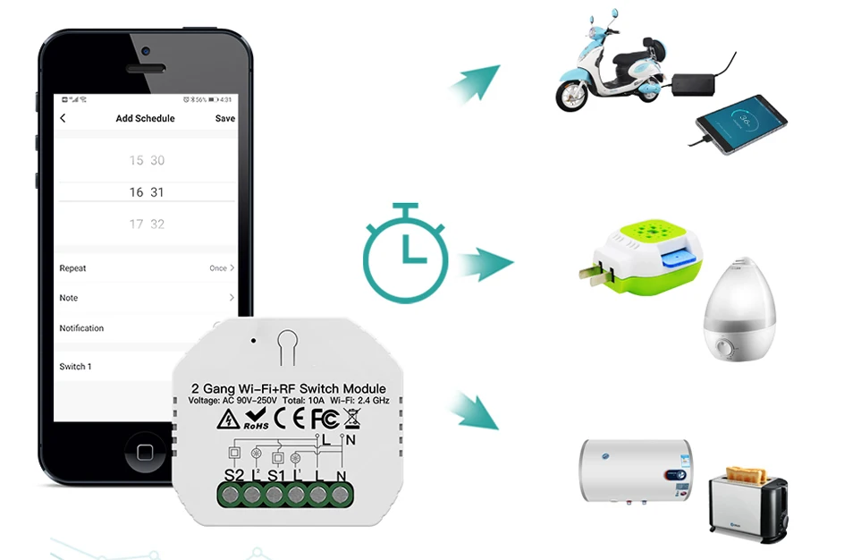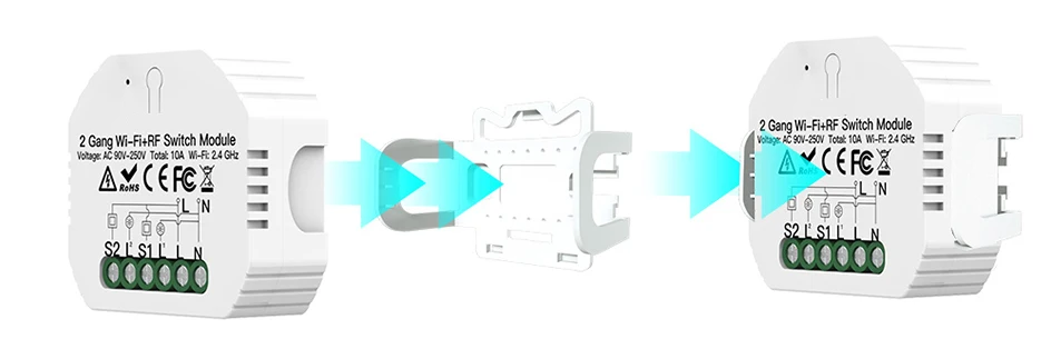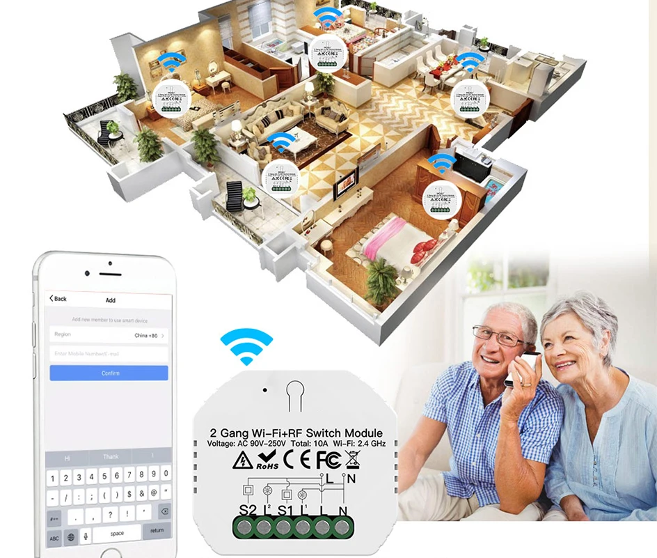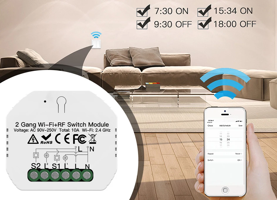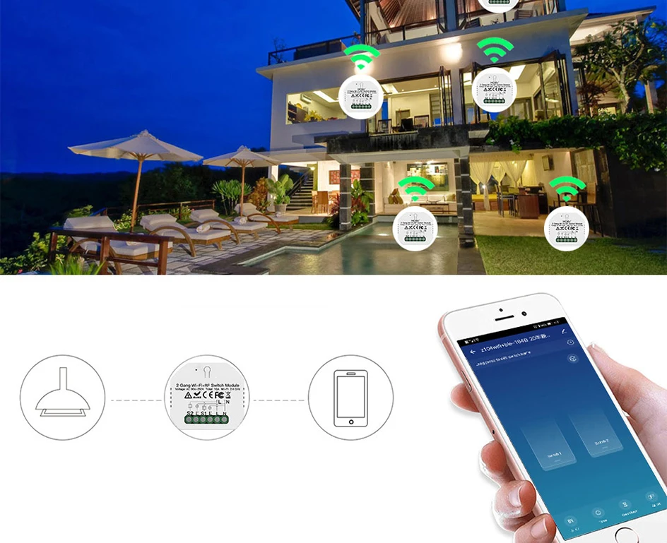 2 банды DIY умный WiFi RF433 светильник выключатель модуль выключатель Tuya Smart Life приложение голосовое Беспроводное дистанционное управление 2-сторонний настенный светильник переключатель работа с Alexa Echo Google Home умный домОсновная особенность:1. Легко заменить ваш традиционный переключатель, чтобы сделать вашу жизнь умнее. Для того, чтобы сделать ваш 2 Gang 2 позиционный переключатель smart, просто нужно установить один YIDI 2 gang беспроводной Интеллектуальный коммутационный модуль с, который подходит для ЕС/Великобритания коробка переключателя. Пожалуйста, подтвердите размер перед заказом.2. Беспроводной пульт дистанционного управления: Управляйте огнями или устройствами через смартфон или Работайте с Alexa \ Google assistant для голосового управления.3. Максимальная нагрузка на напряжение этого модуля переключателя составляет 220-250вольт и 2x5 ампер. Он сможет управлять различными видами освещения и приборов.4. Предоставление 2,4G сетей с ваш мобильный телефон для подключения модуля переключателя, не требуется концентратор.5. Популярное универсальное приложение, такое как smart life / Tuya (Android / iOS), позволяет полностью контролировать ваши огни или совместимые устройства. Несколько вариантов программы позволяют нам устанавливать расписание для автоматического включения ламп, вентиляторов или других устройств.6. Дайте вашим устройствам идеальный умный Макияж. Вам просто нужно подключить этот умный модуль с вашим устройством и источником питания, и большинство совместимых продуктов могут быть преобразованы в умные.Параметр:Вход Напряжение: 90V ~ 250V / 50/60Hz, общая 10AПроводка: прямой провод и нейтральный проводМаксимальная мощность нагрузки: Total10AWi-Fi, Стандартный: 2,4 ГГц 802,11 b/g/nНазвание приложения: Tuya Smart/Smart LifeСрок работы: 100000 во время проведения операцииРазмер: 47x52x18 ммЧасто задаваемые вопросы:В: Что делать, если я не могу настроить этот модуль переключателя?A: a. Проверьте, включено ли устройство.B. Пожалуйста, убедитесь, что ваш мобильный телефон и модуль автоматического включения света находятся под одной и той же 2,4 ГГц WI-FI сети.С. Находится ли он в хороших интернет-условиях.D. Убедитесь, что пароль, введенный в приложении, верен.E. Убедитесь, что способ подключения правильный.В: Какие продукты я могу контролировать с устройством?О: вы можете управлять всеми типами ламп и eleCtrical продукты в соответствии со спецификациями устройстваВ: Что произойдет, если WIFI выключится?О: вы все еще можете управлять устройством, подключенным к модулю переключателей, с вашим традиционным переключателем. После того, как WIFI снова активен, устройство, подключенное к модулю, автоматически подключается к вашей сети Wi-Fi.