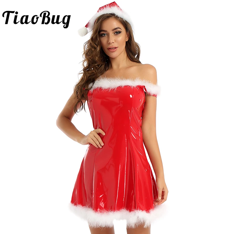 Женское рождественское нарядное платье Mrs Santa Claus; Рождественский костюм; Платье с шапкой; Мокрый внешний вид.