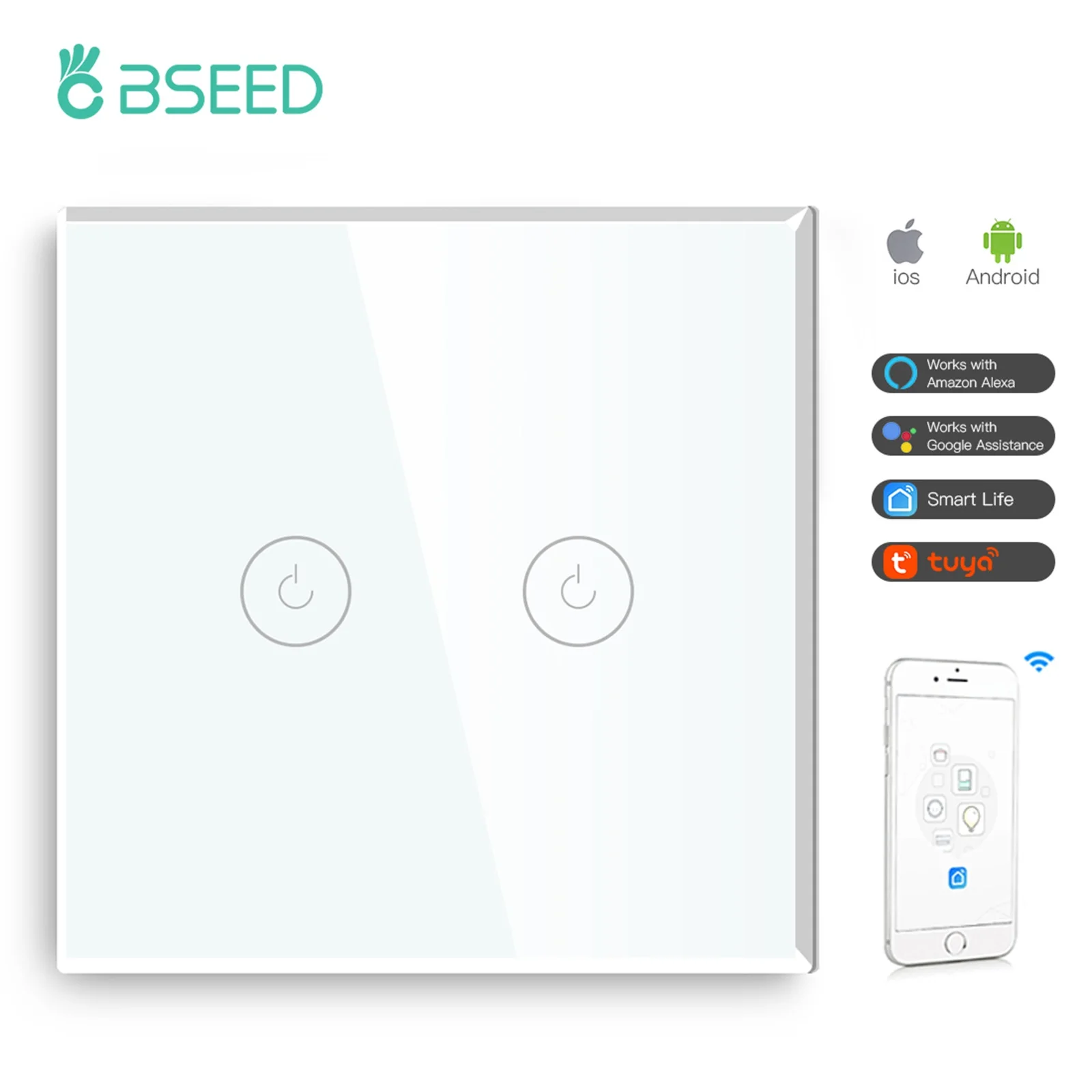 Сенсорный выключатель Bseed с Wi-Fi, сенсорный переключатель с 2 клавишами, европейский стандарт, черный, белый, золотой, серый, со стеклянной панелью, работает с Tuya Smart