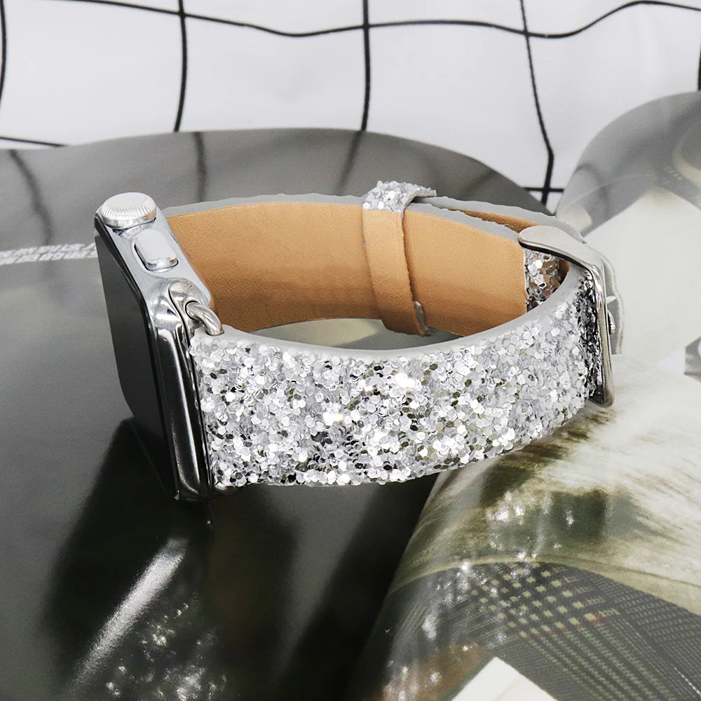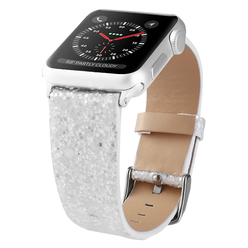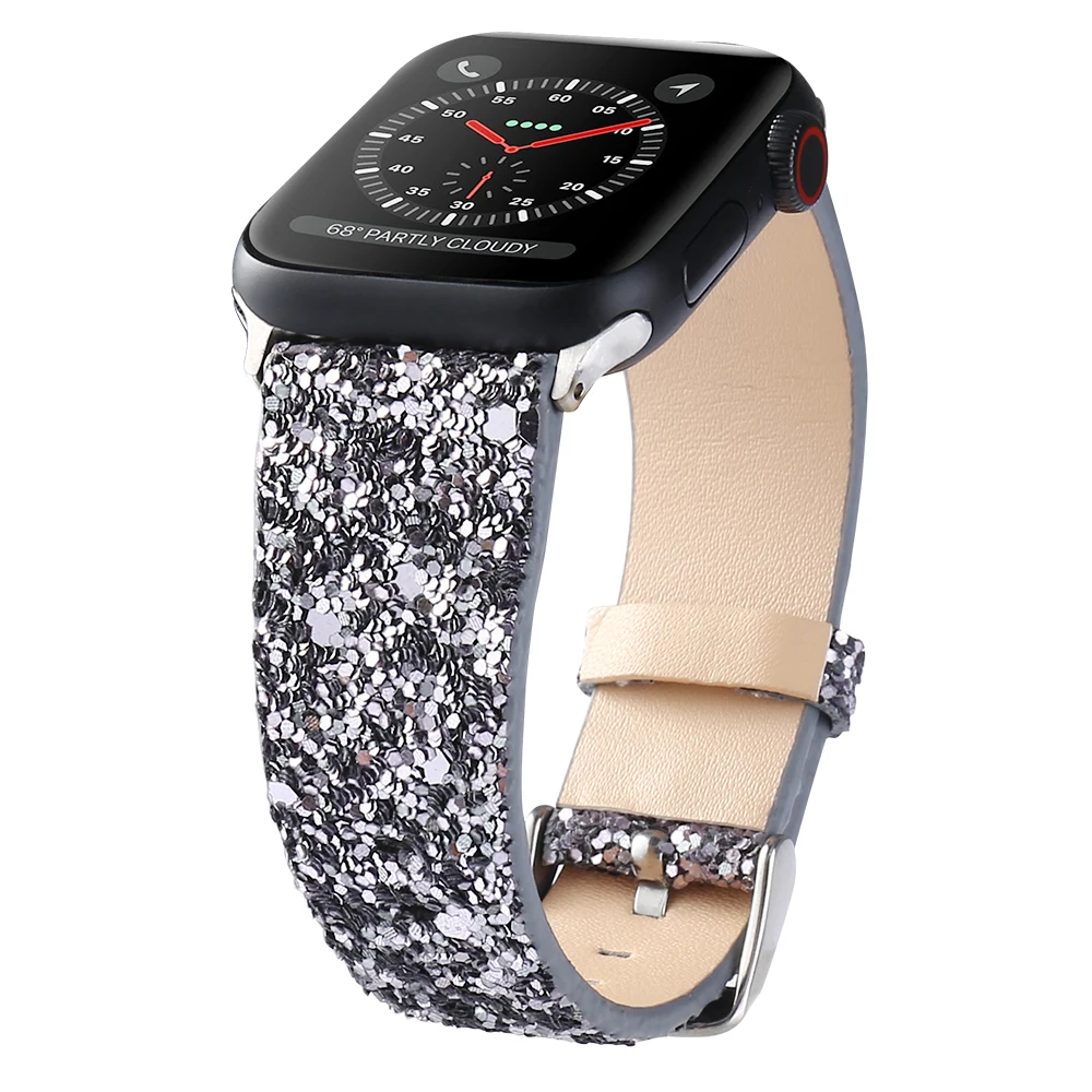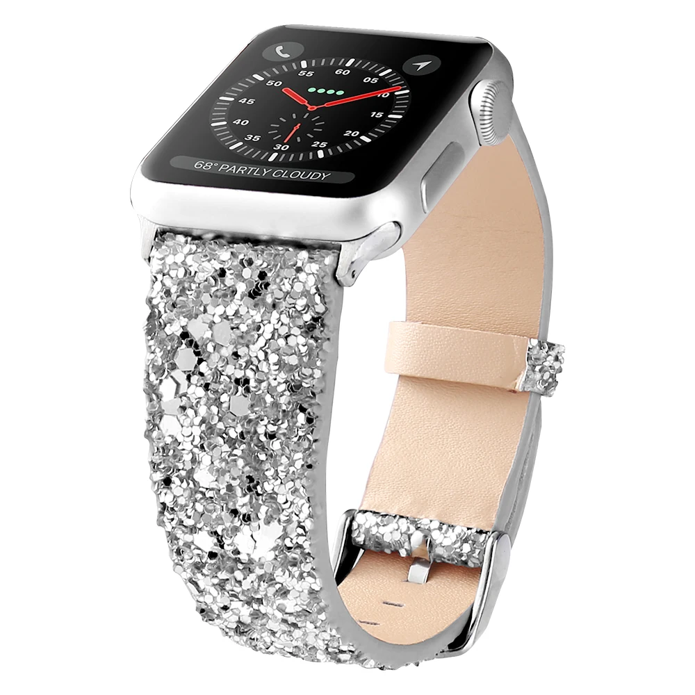 38 мм/40 мм полосы для Apple Watch 38 мм серии 3/2/1 и Apple watch 40 мм серии 6/5/4/SE. Подходит для запястья размером 5,3 дюйма-7,3 дюйма (135 мм-195 мм) 42 мм/44 мм полосы для Apple Watch 42 мм серии 3/2/1 и Apple watch 44 мм серии 6/5/4/SE. Подходит для запястья размером 5,5 дюйма-7,9 дюйма (140 мм-210 мм) Роскошные блестящие Браслеты изготовлены из мягкой искусственной кожи, светильник с 3D блестками на поверхности, удобные и прочные, Блестящие Блестки очаровательны, особенно под солнцем или светильник, сделайте ваши iWatch более чем куском ювелирных изделий.