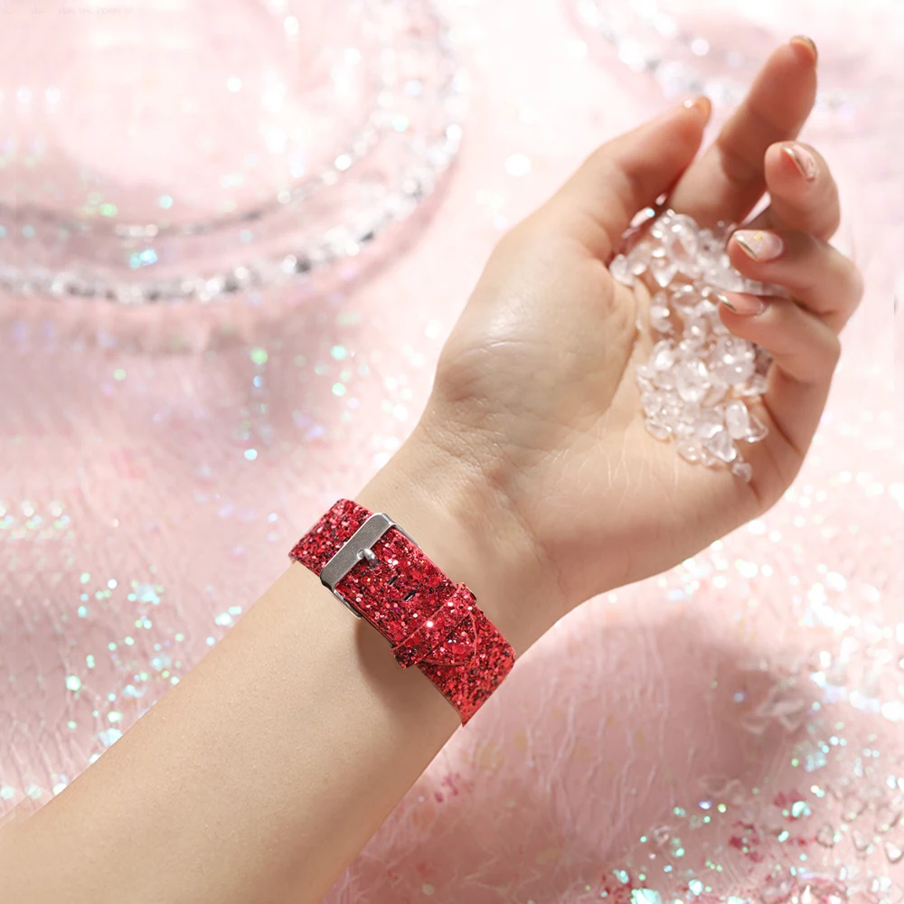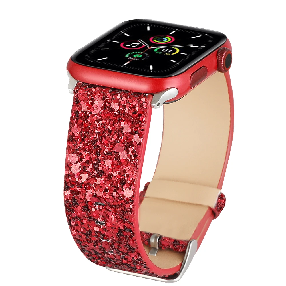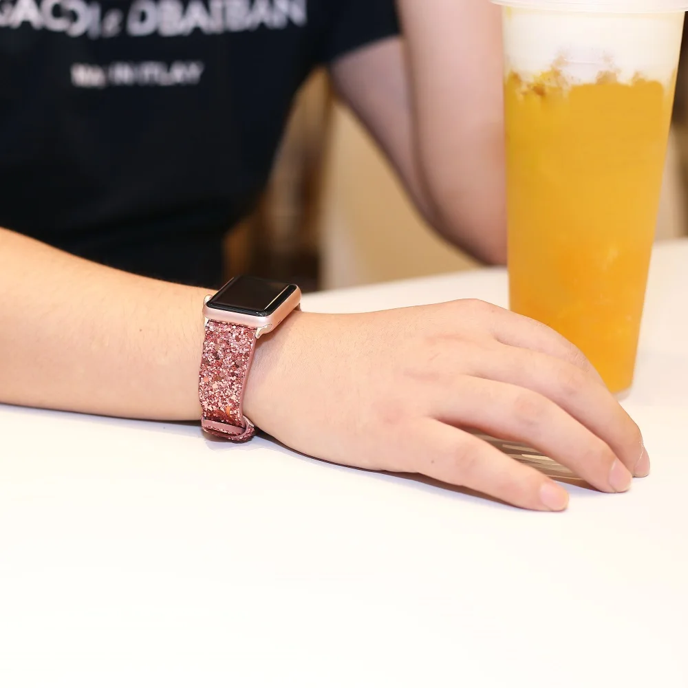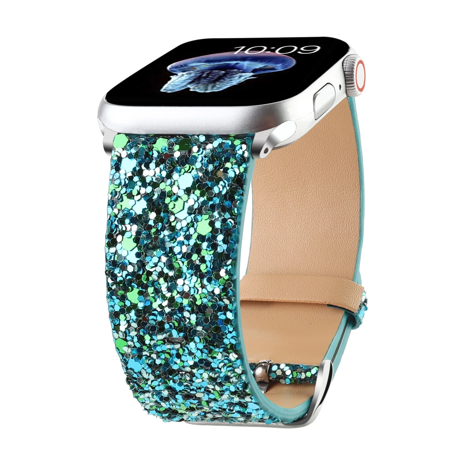 38 мм/40 мм полосы для Apple Watch 38 мм серии 3/2/1 и Apple watch 40 мм серии 6/5/4/SE. Подходит для запястья размером 5,3 дюйма-7,3 дюйма (135 мм-195 мм) 42 мм/44 мм полосы для Apple Watch 42 мм серии 3/2/1 и Apple watch 44 мм серии 6/5/4/SE. Подходит для запястья размером 5,5 дюйма-7,9 дюйма (140 мм-210 мм) Роскошные блестящие Браслеты изготовлены из мягкой искусственной кожи, светильник с 3D блестками на поверхности, удобные и прочные, Блестящие Блестки очаровательны, особенно под солнцем или светильник, сделайте ваши iWatch более чем куском ювелирных изделий.