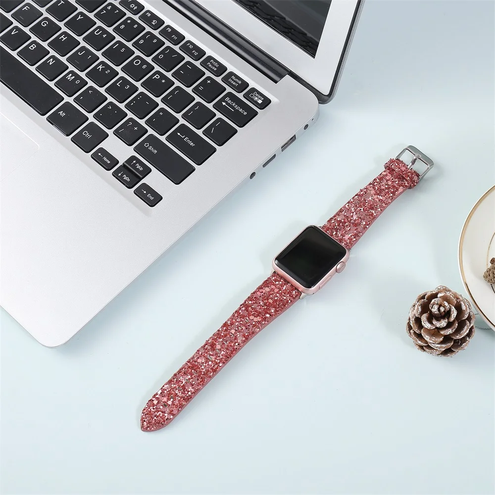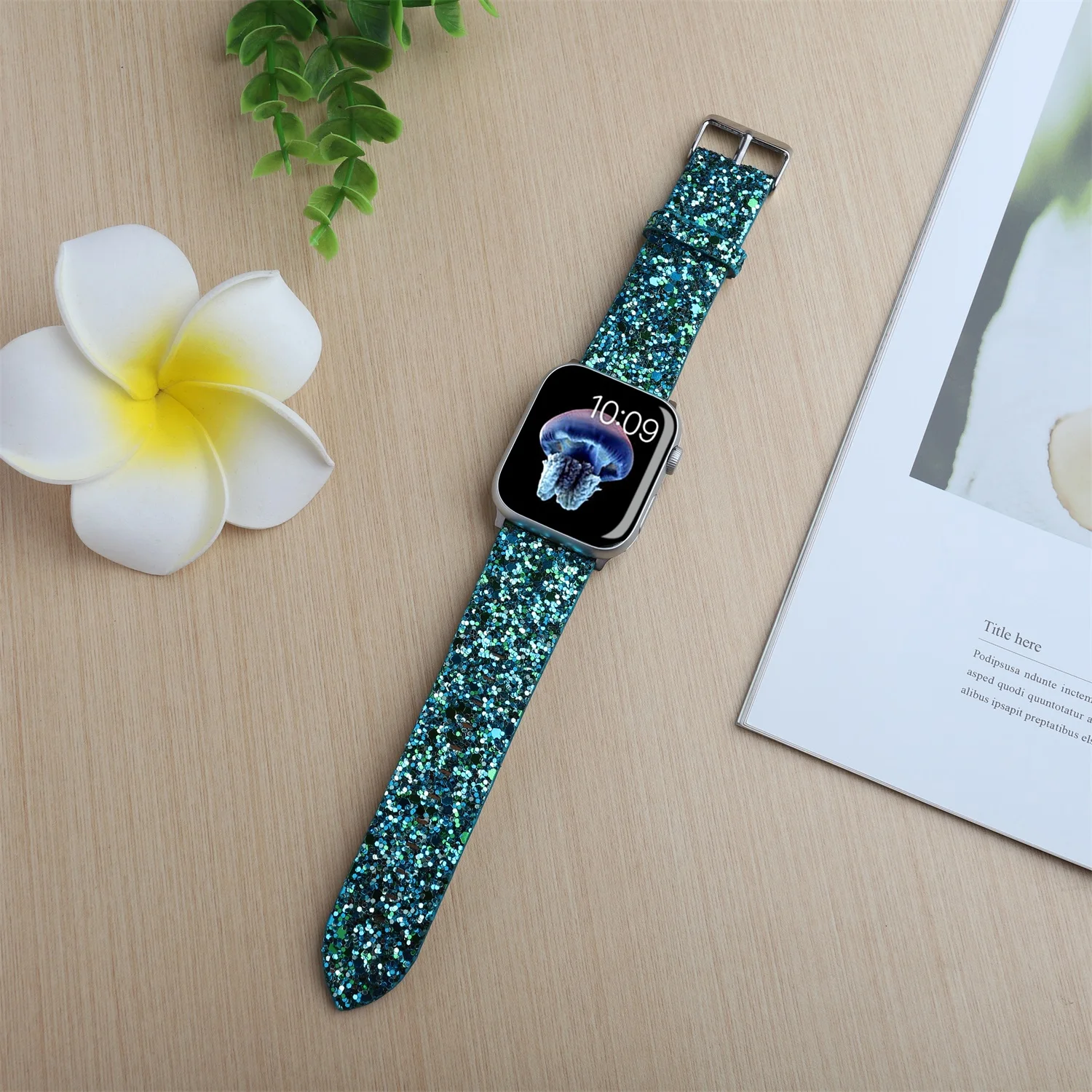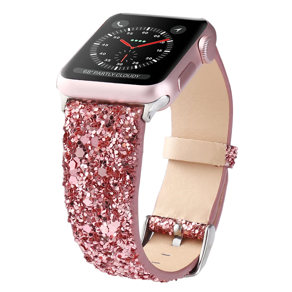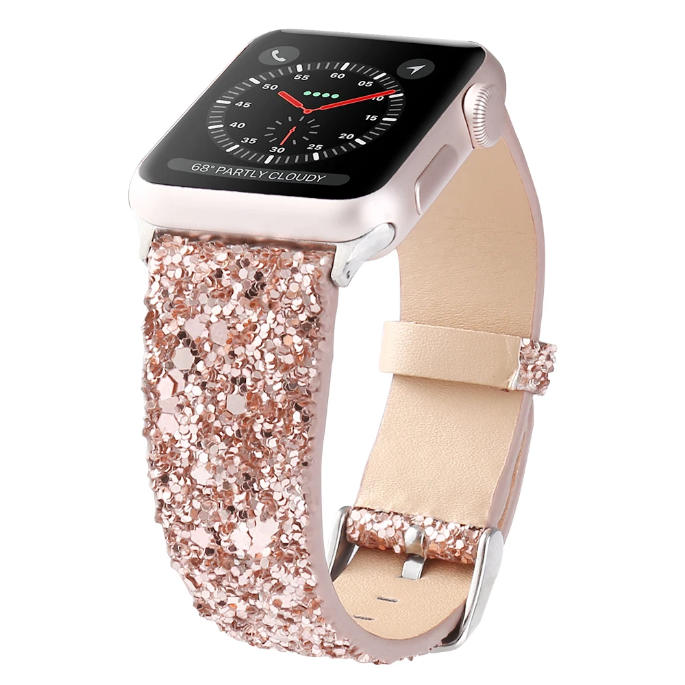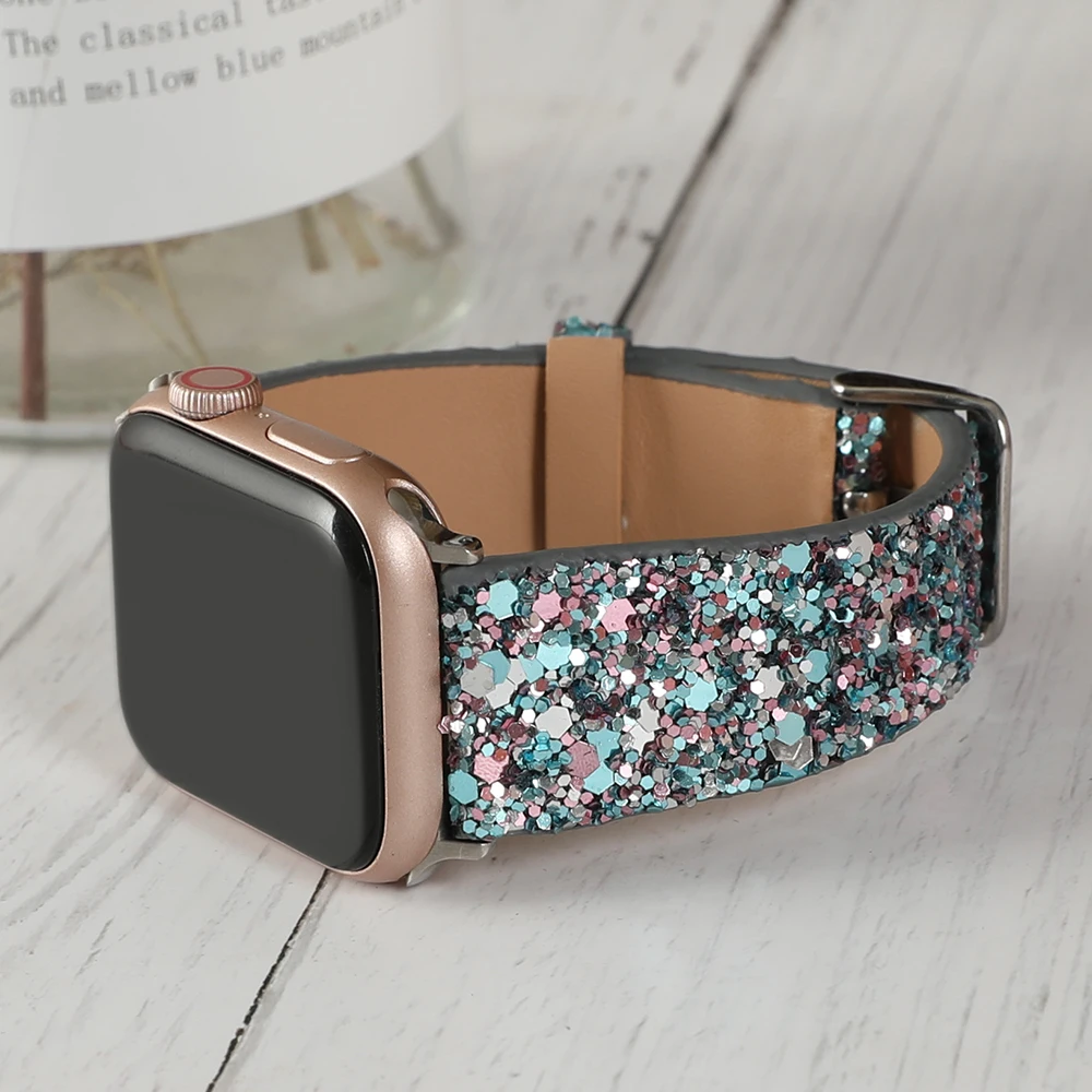 Ремешок кожаный для Apple Watch Band 38 мм 40 мм 42 мм 44 мм, блестящий женский браслет для iWatch Series 6 5 4 3 2 1 SE