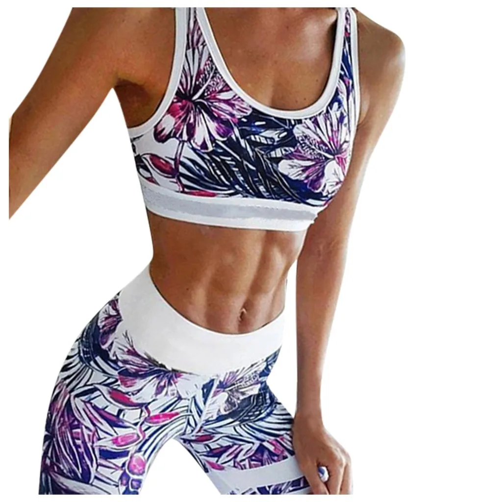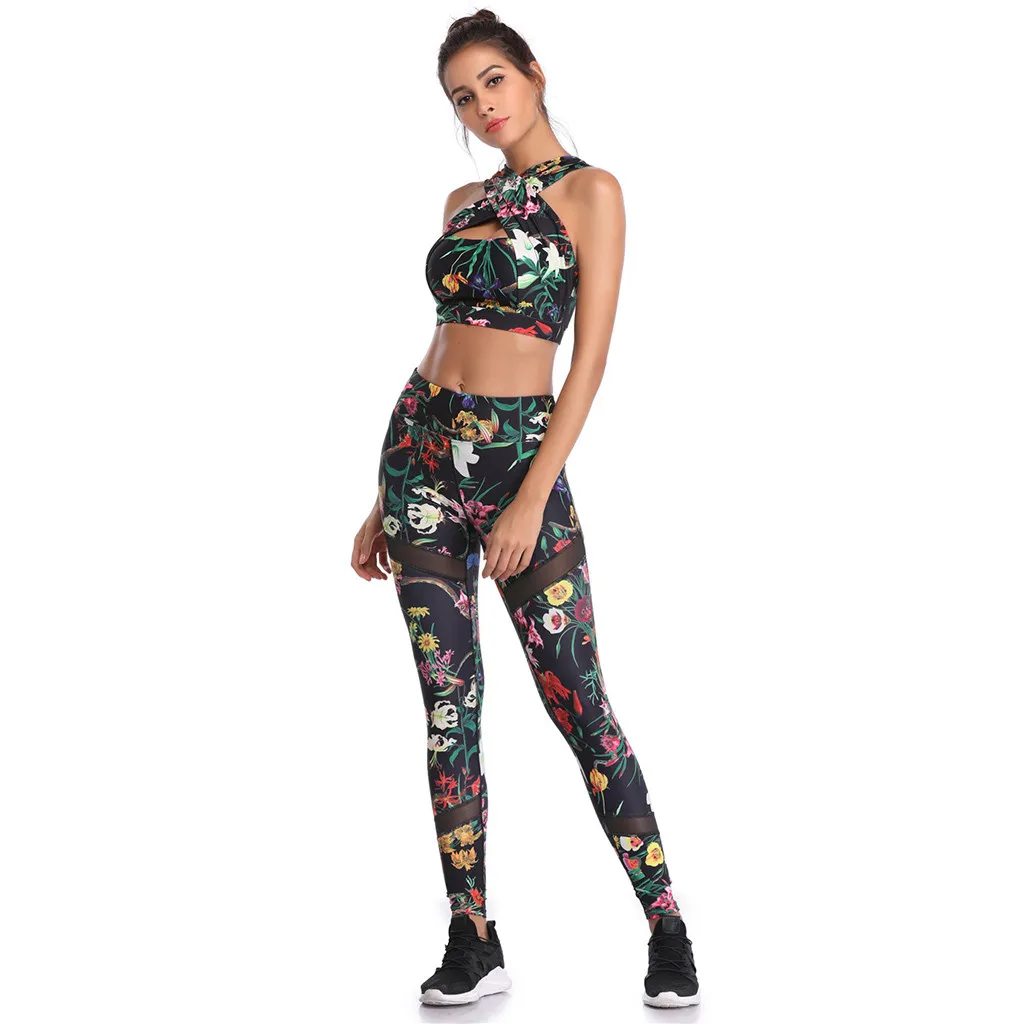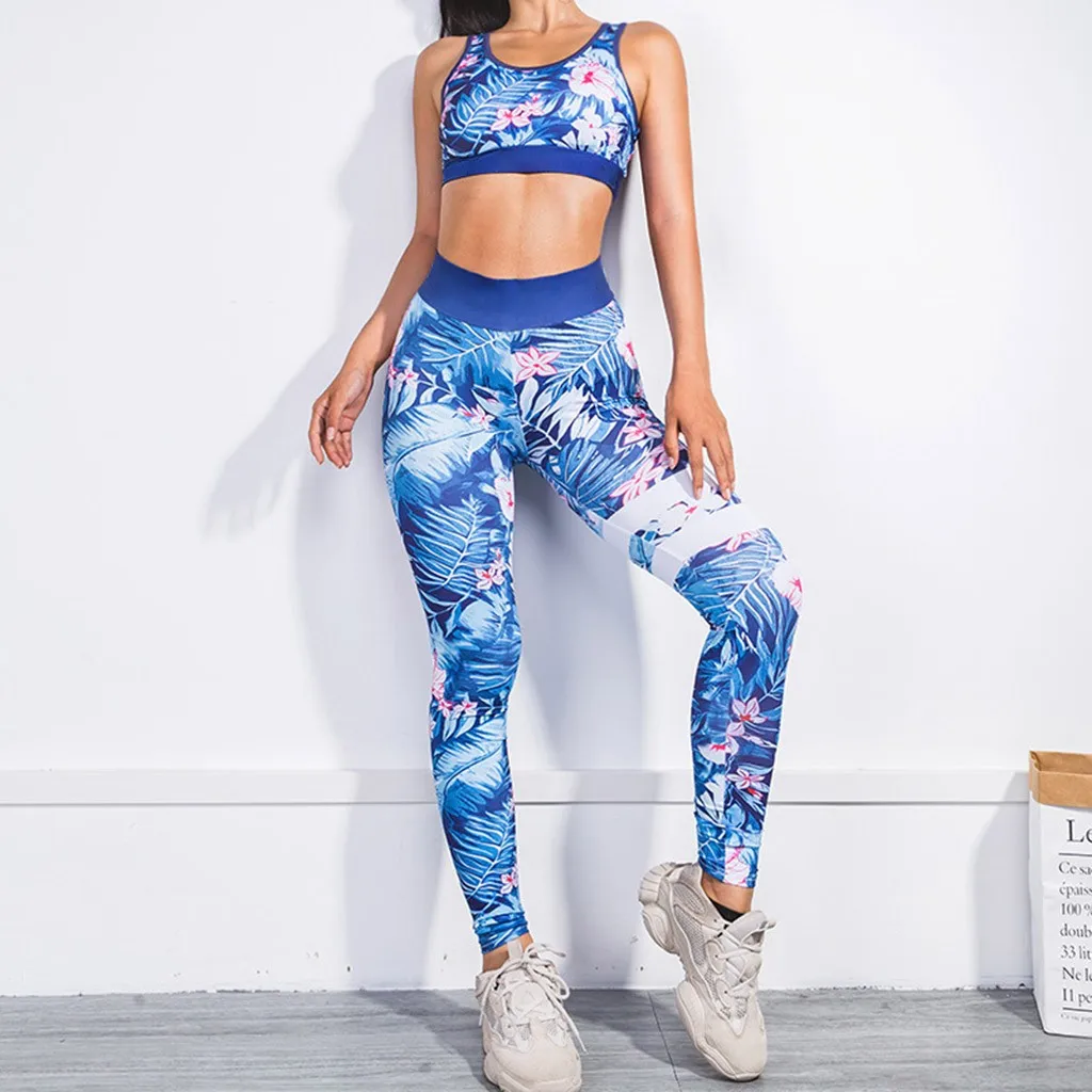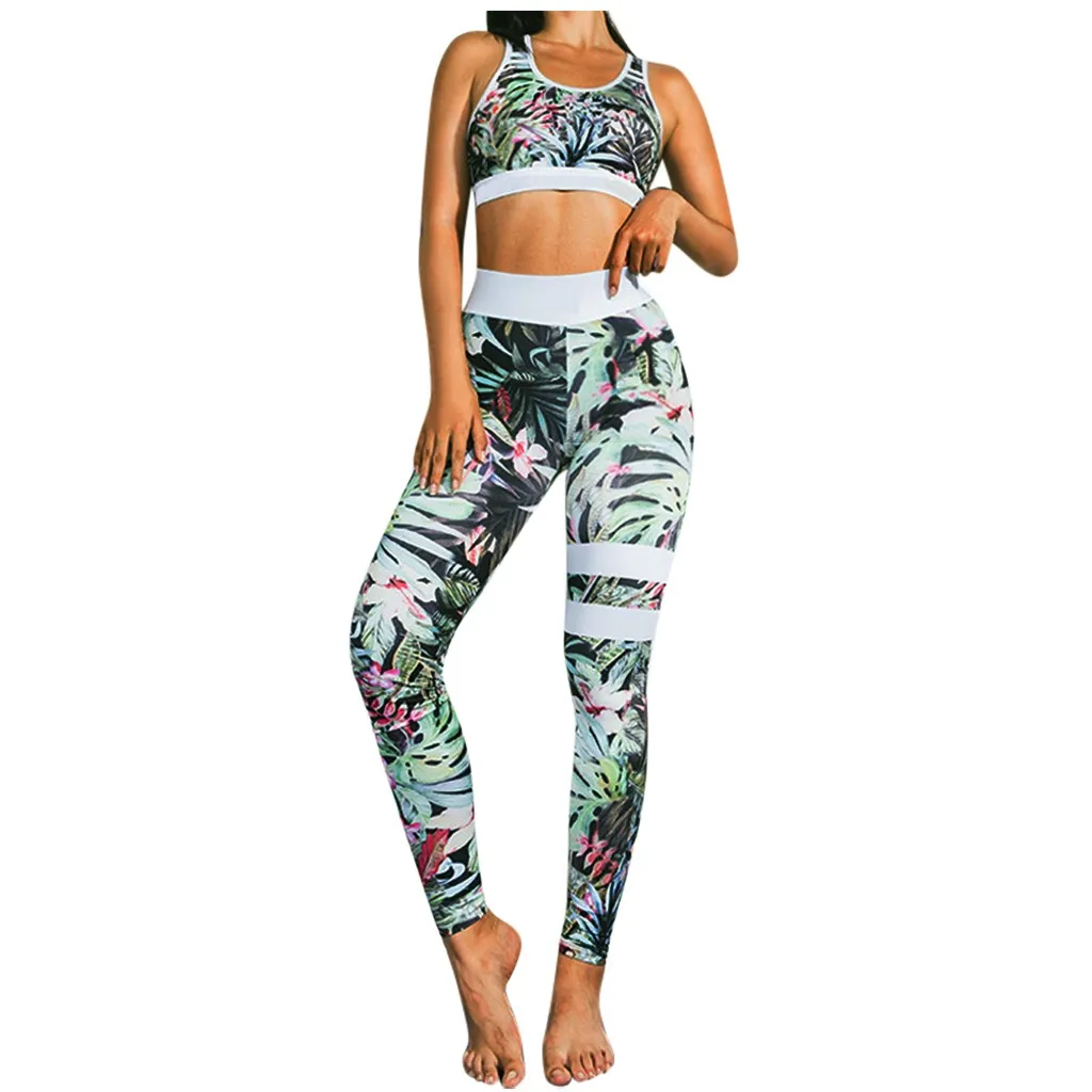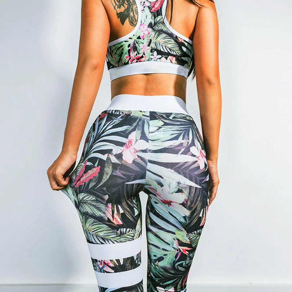 Женский спортивный костюм, женский комплект для йоги, спортивный костюм для девушек с принтом растений, камуфляж, высокая талия, бедра, штаны для бега, фитнеса, йоги, костюм