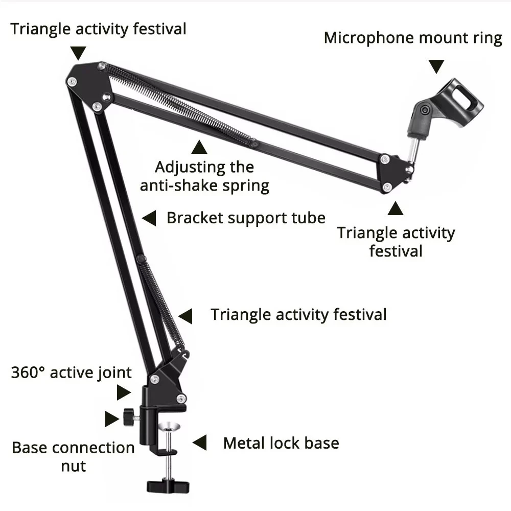 4. Регулируемый зажим для легкого крепления на рабочем столе, надежно фиксируется к любой подставке для микрофона для легкой установки и удобства в использовании. Двойные пружины подвески на каждом рычаге стрелы для дополнительной устойчивости.