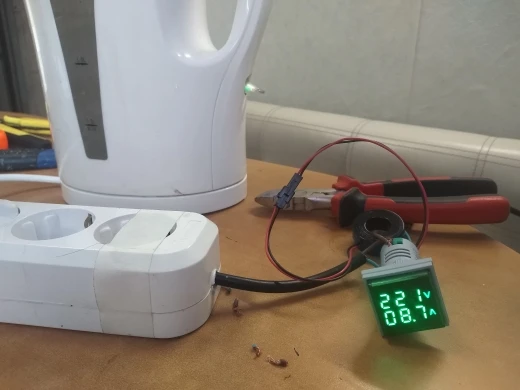Все работает, но когда для проверки подключил лампочку 60Вт, ток не показывал, в одном из отзывов прочитал, что ток менее 0,6А не измеряет. Подключил чайник - ток замеряет. Но он мне и нужен для работы с тэном на 2кВт, так что для меня все устраивает.