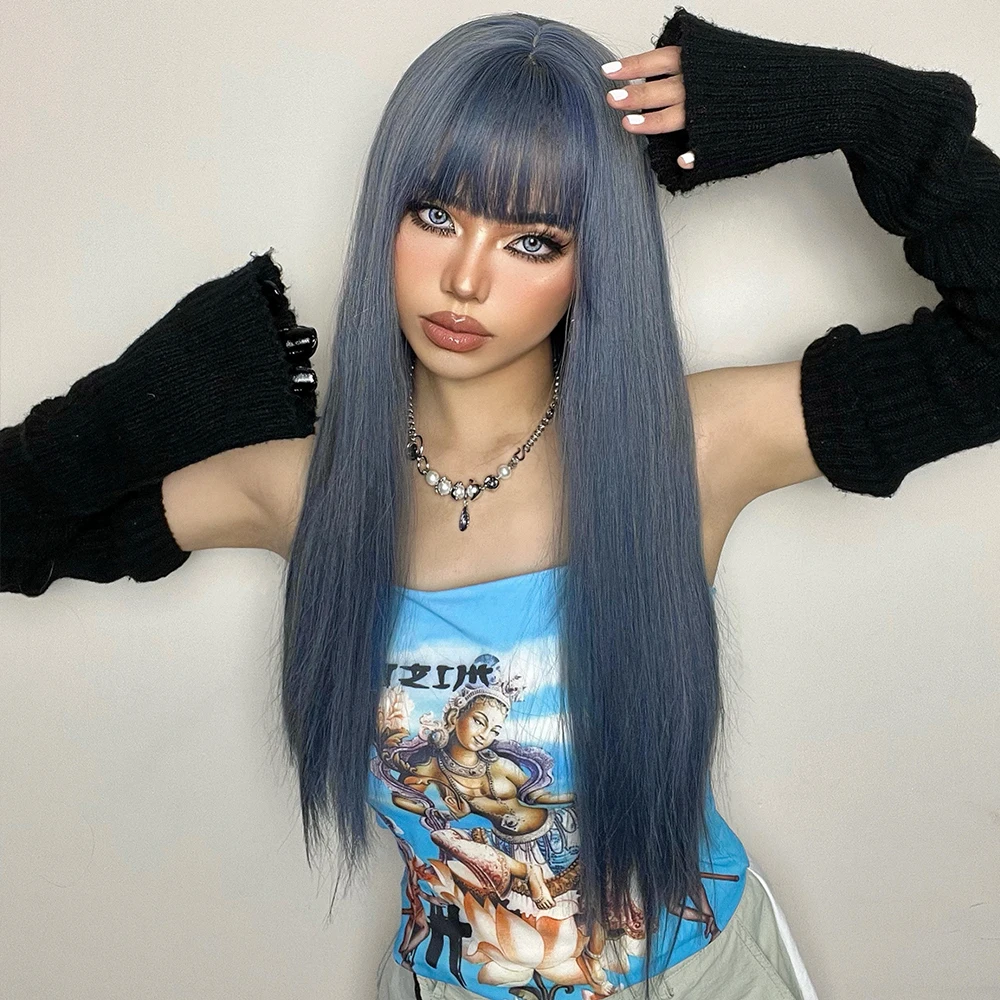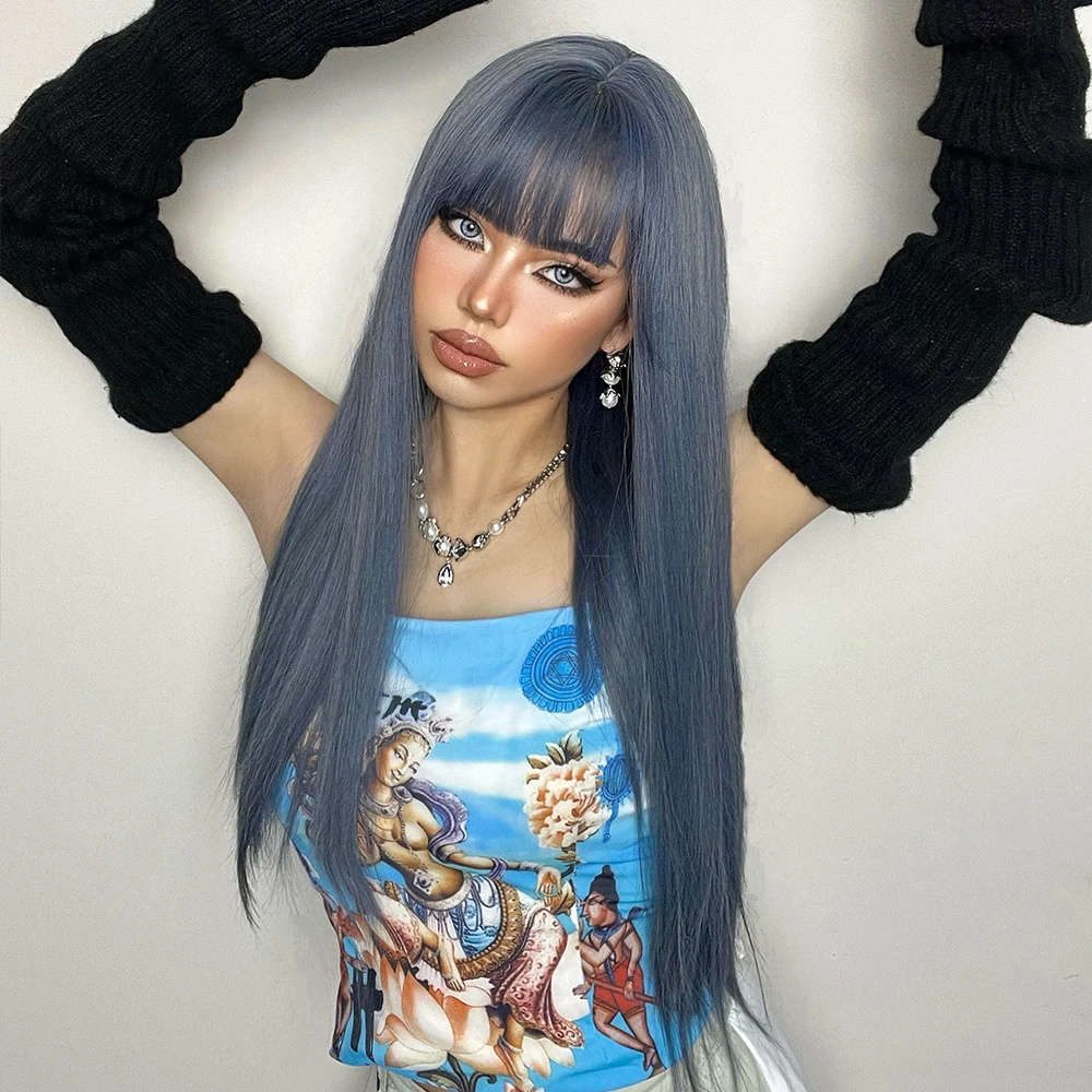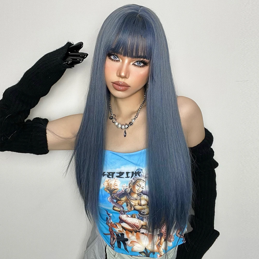Длинные прямые Синие Серые синтетические парики с челкой henmargu, синие натуральные волосы для женщин, термостойкие, для косплея