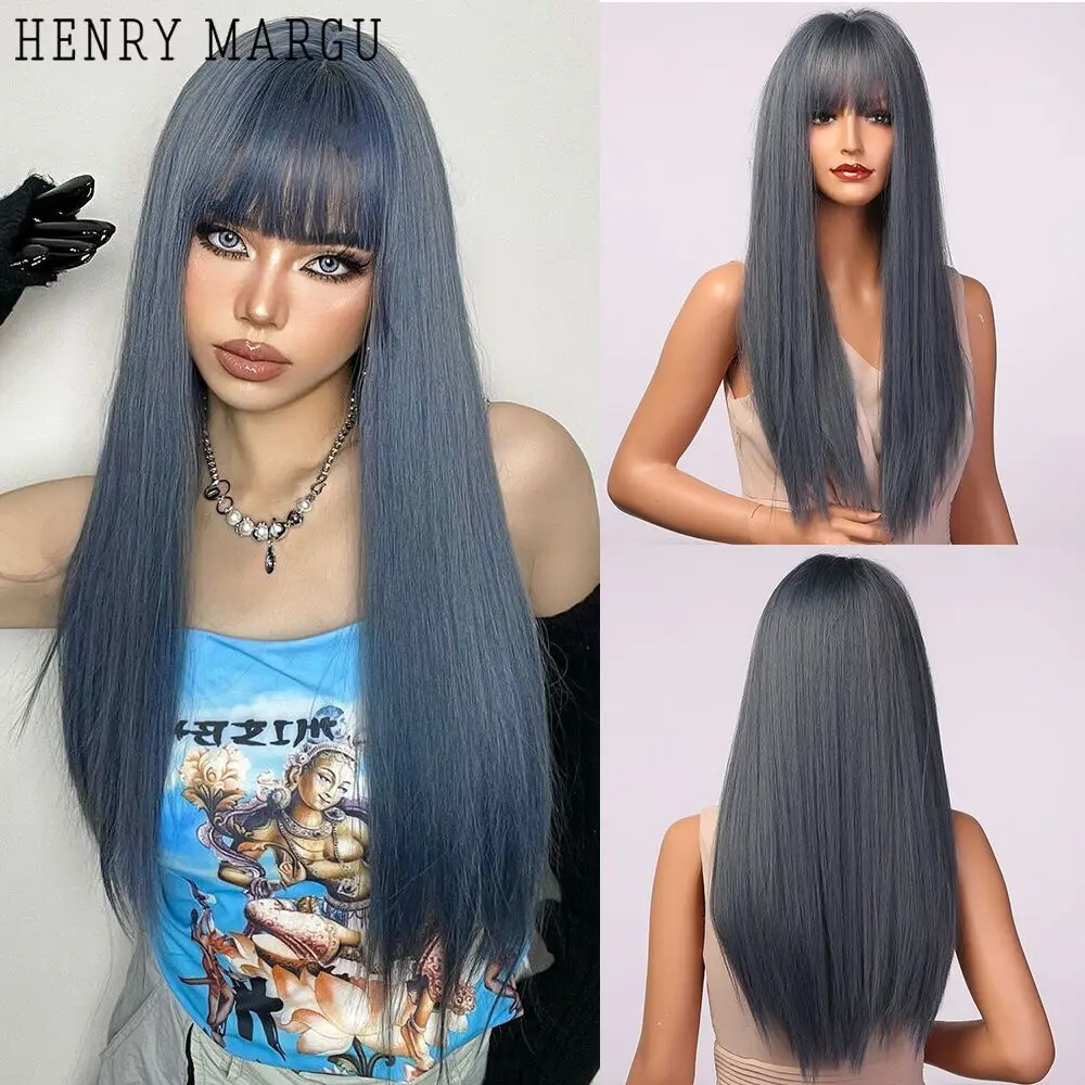 HENRY MARGU длинные прямые Голубые Серые синтетические парики с челкой синие натуральные волосы для женщин термостойкие косплей парики на каждый день