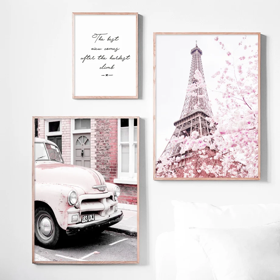 Картина на холсте с изображением розовой Парижской башни, уличных пионов, цветов, в скандинавском стиле, настенные картины для украшения гостиной