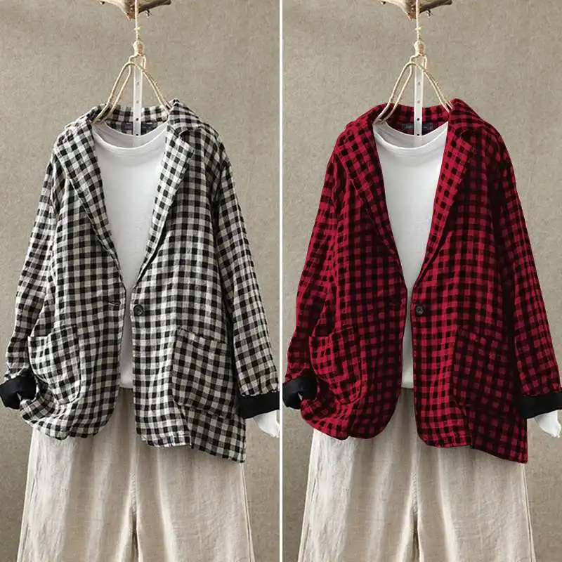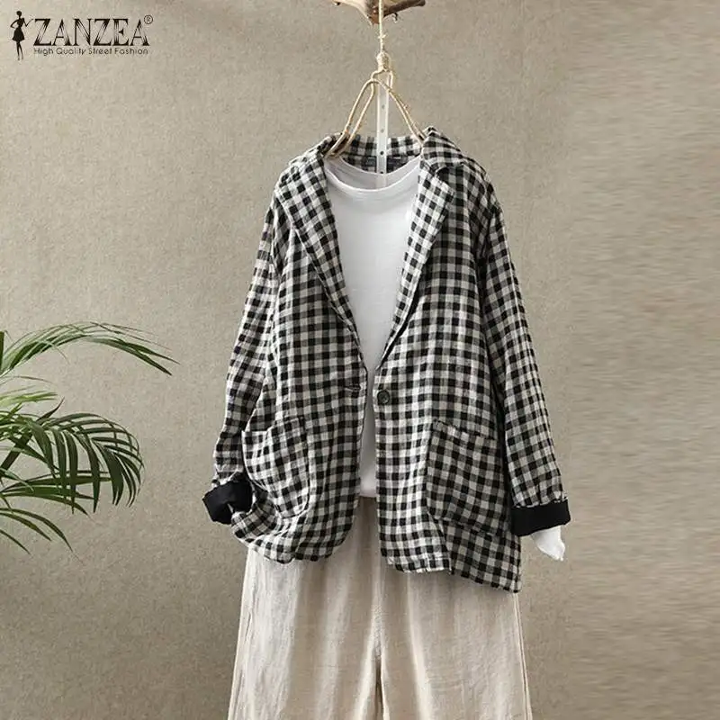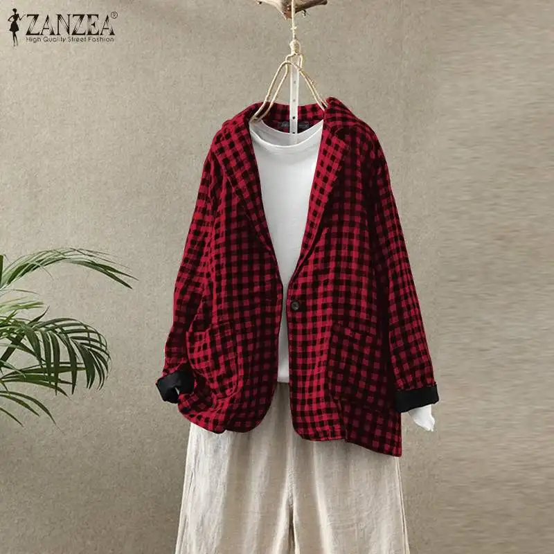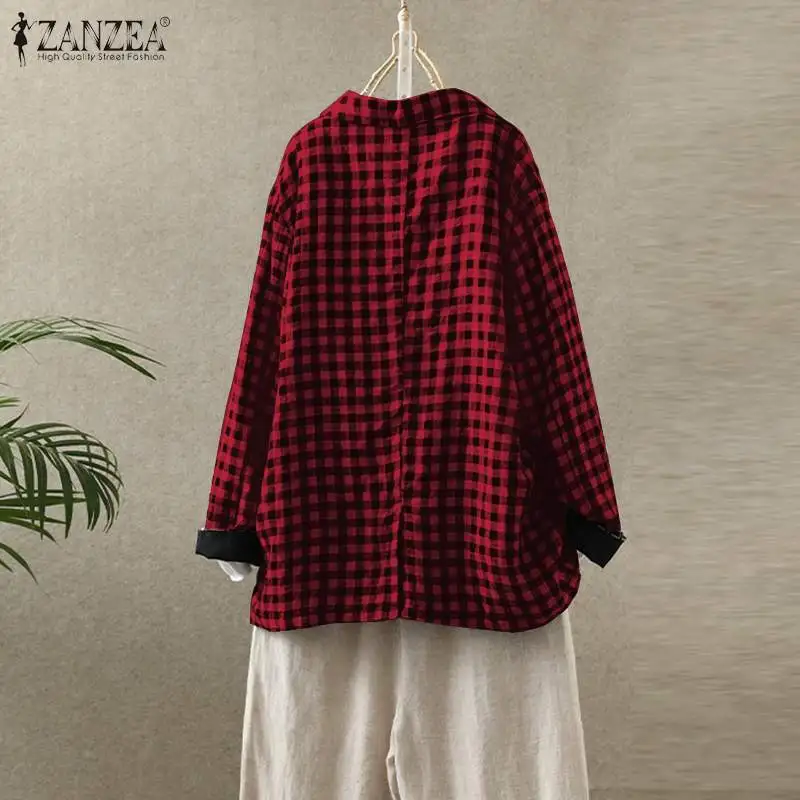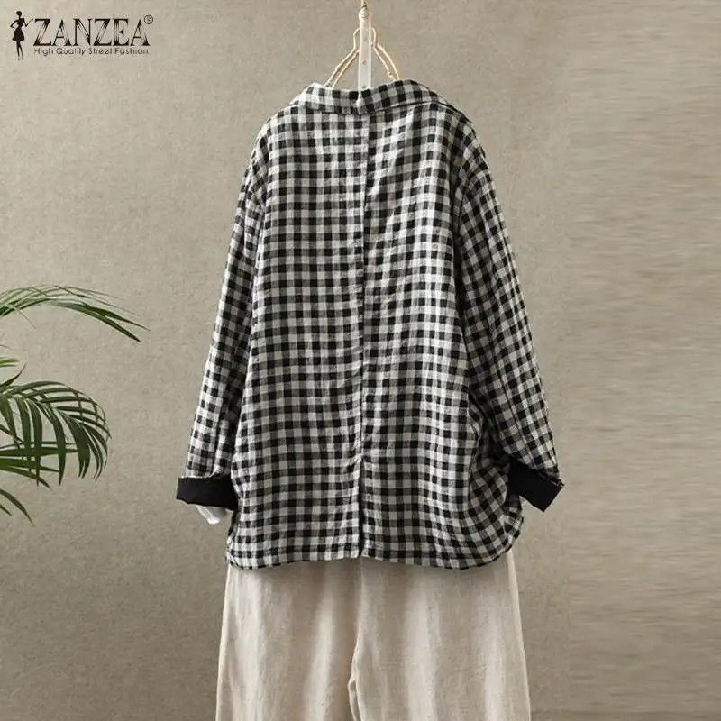 Топы, Женская Осенняя блузка ZANZEA 2021, винтажные клетчатые рубашки, повседневные тонкие пальто с длинным рукавом, женские блузы на пуговицах с лацканами