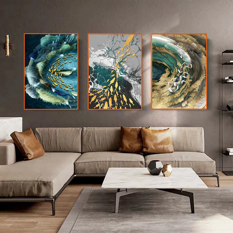 Современный постер с золотым пером, настенная живопись, синий, зеленый, рыба, абстрактный холст, настенная живопись, живое модное украшение для комнаты