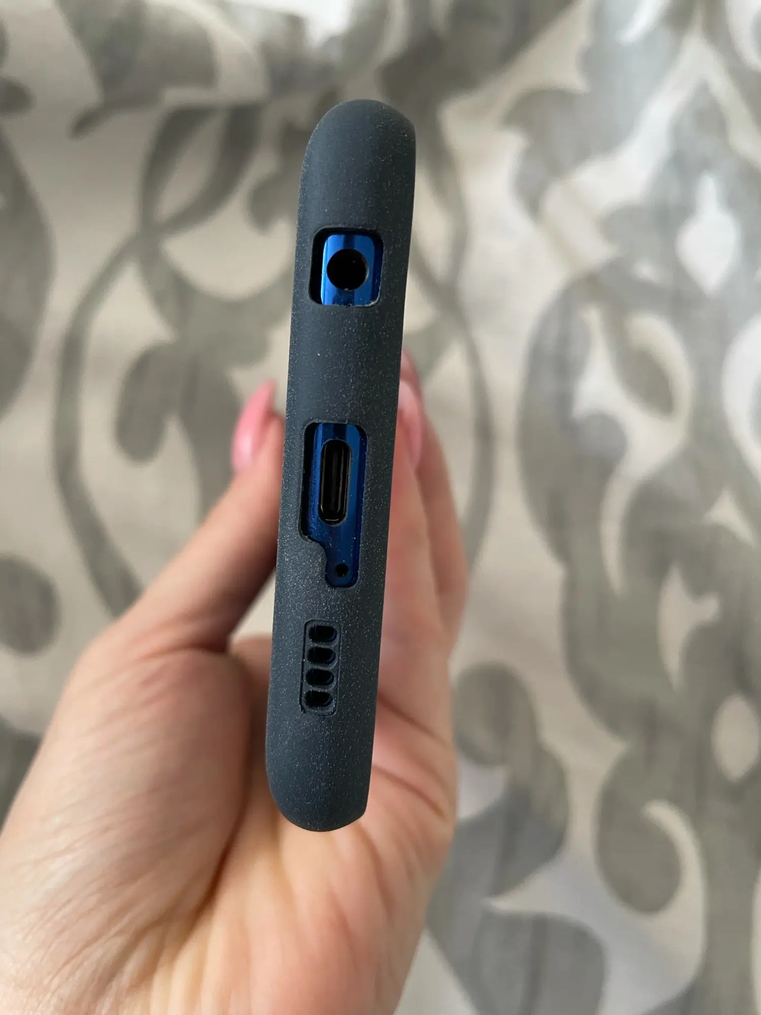 чехол очень приятный на ощупь, гладкий. камеру закрывает хорошо, но отсутствует заглушка для гнезда зарядки, неудобно. ещё рамка вокруг экрана выпирает очень слабо, при падении экраном вниз боюсь задеть может сам экран. уже ронял со стандартным чехлом, там рамки приняли удар на себя