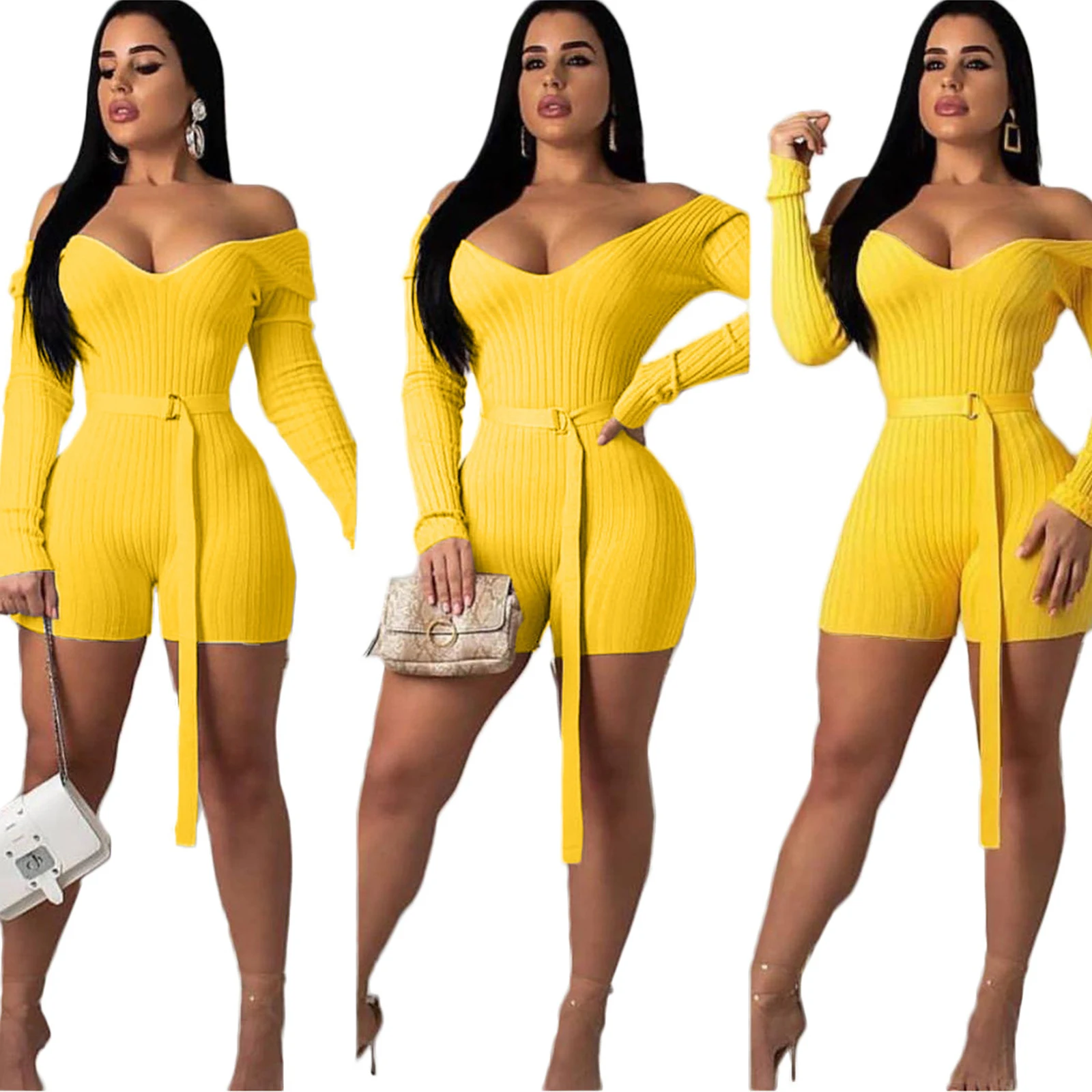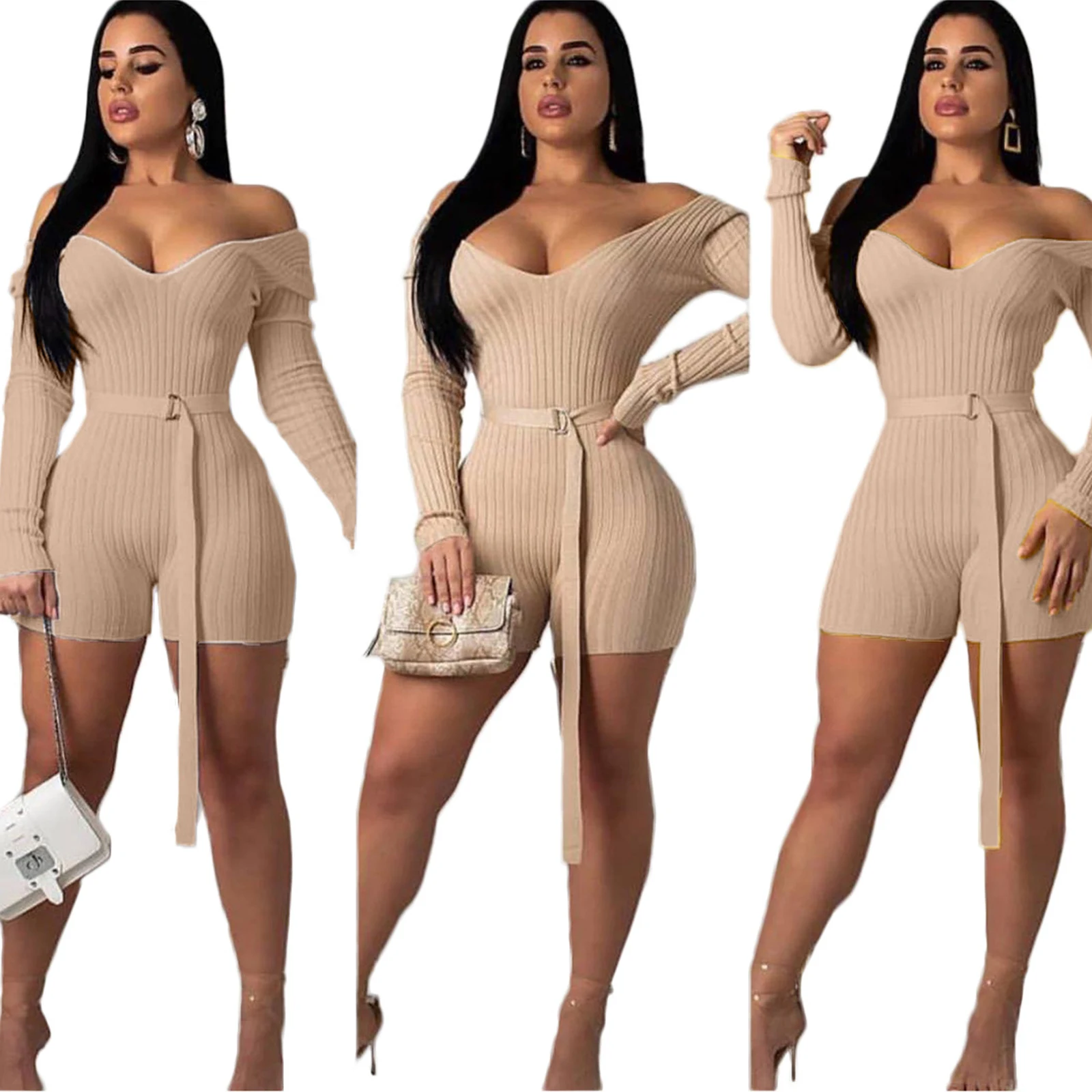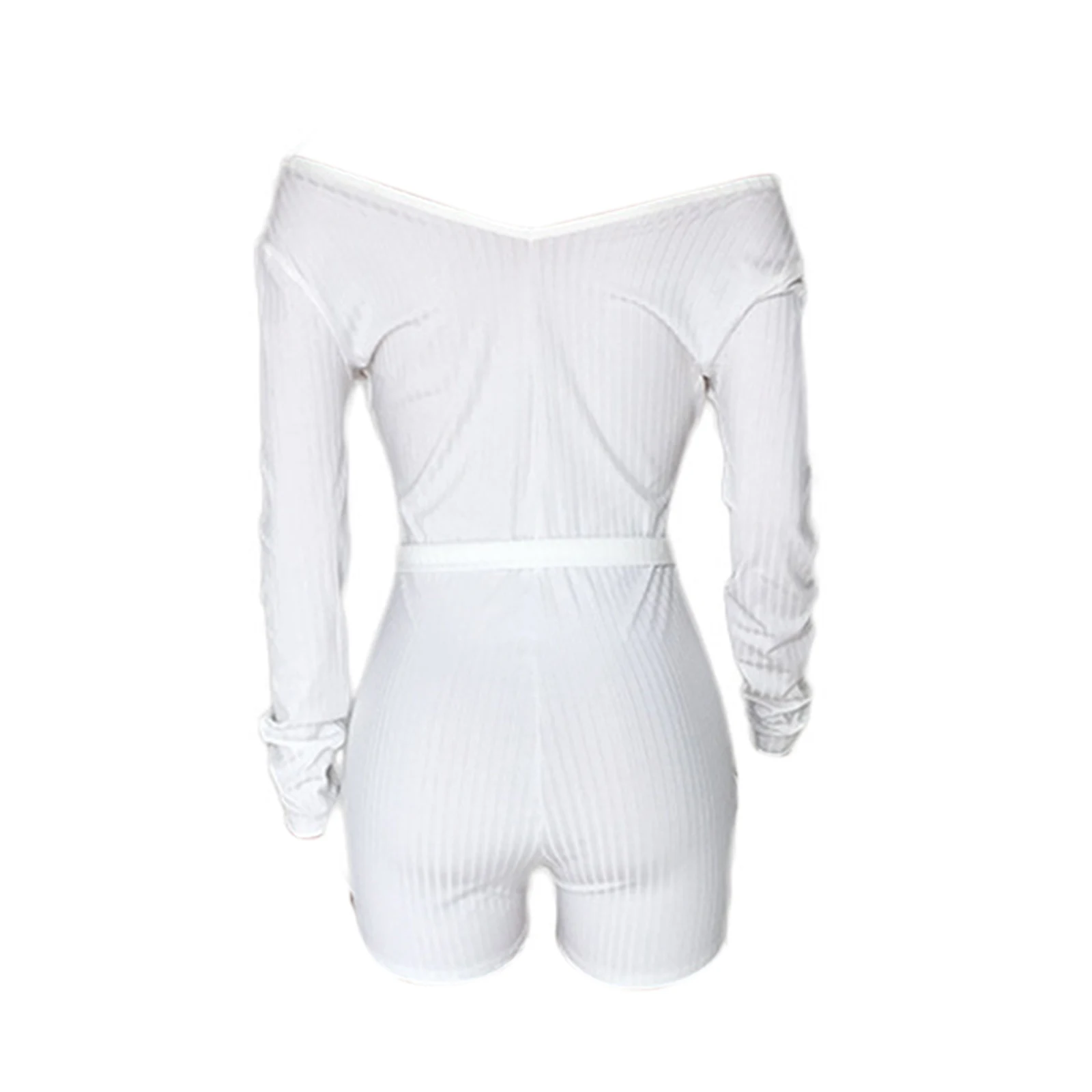 Комбинезон женский трикотажный в рубчик, с открытыми плечами, с V-образным вырезом и длинным рукавом, весна-осень