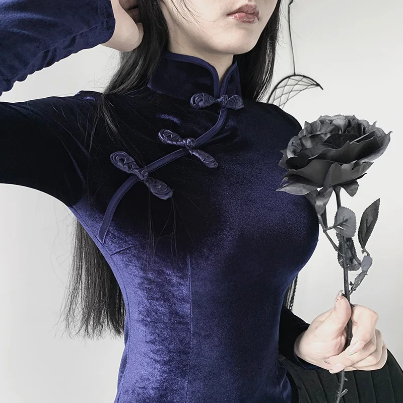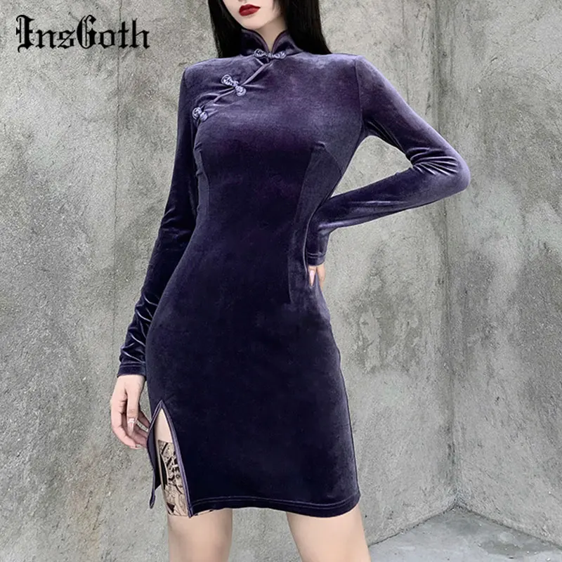 Женское бархатное платье-Ципао InsGoth, винтажное готическое облегающее платье фиолетового цвета с высокой талией, элегантное вечернее платье с длинным рукавом