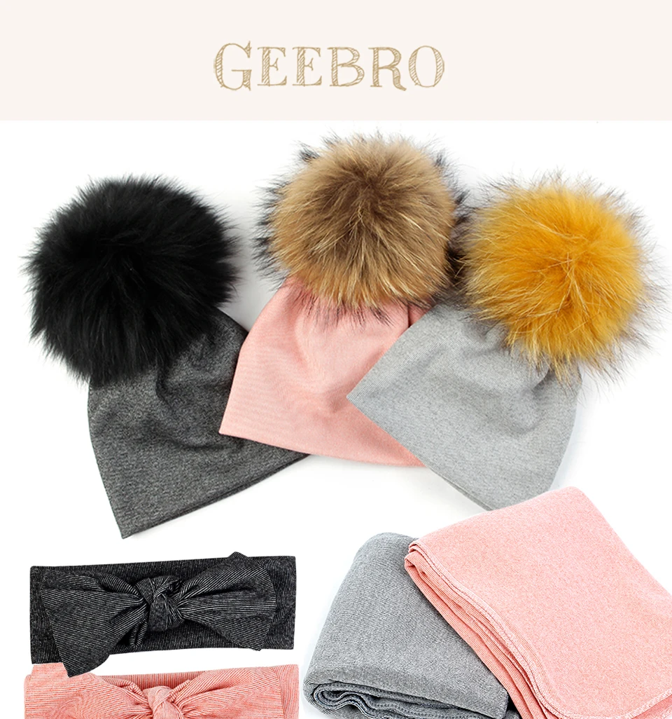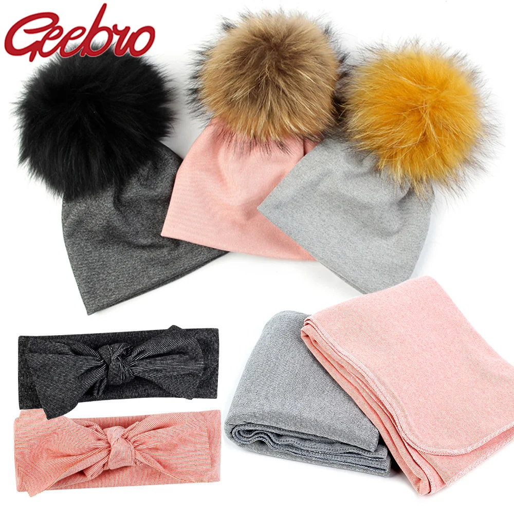 Geebro зимние хлопковые эластичные облегающие шапки для новорожденных девочек и мальчиков, детское постельное белье с зеленым помпоном, комплект одеяла, повязки на голову