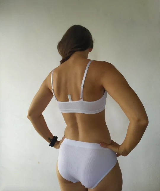 Очень качественный комплект за свои деньги, все швы ровные, ткань приятная у телу. На об 100 низ сидит комфортно, ничего не дает и не перетягивает, верх также прекрасно сидит и хорошо выглядит, несмотря на то, что нет чашек