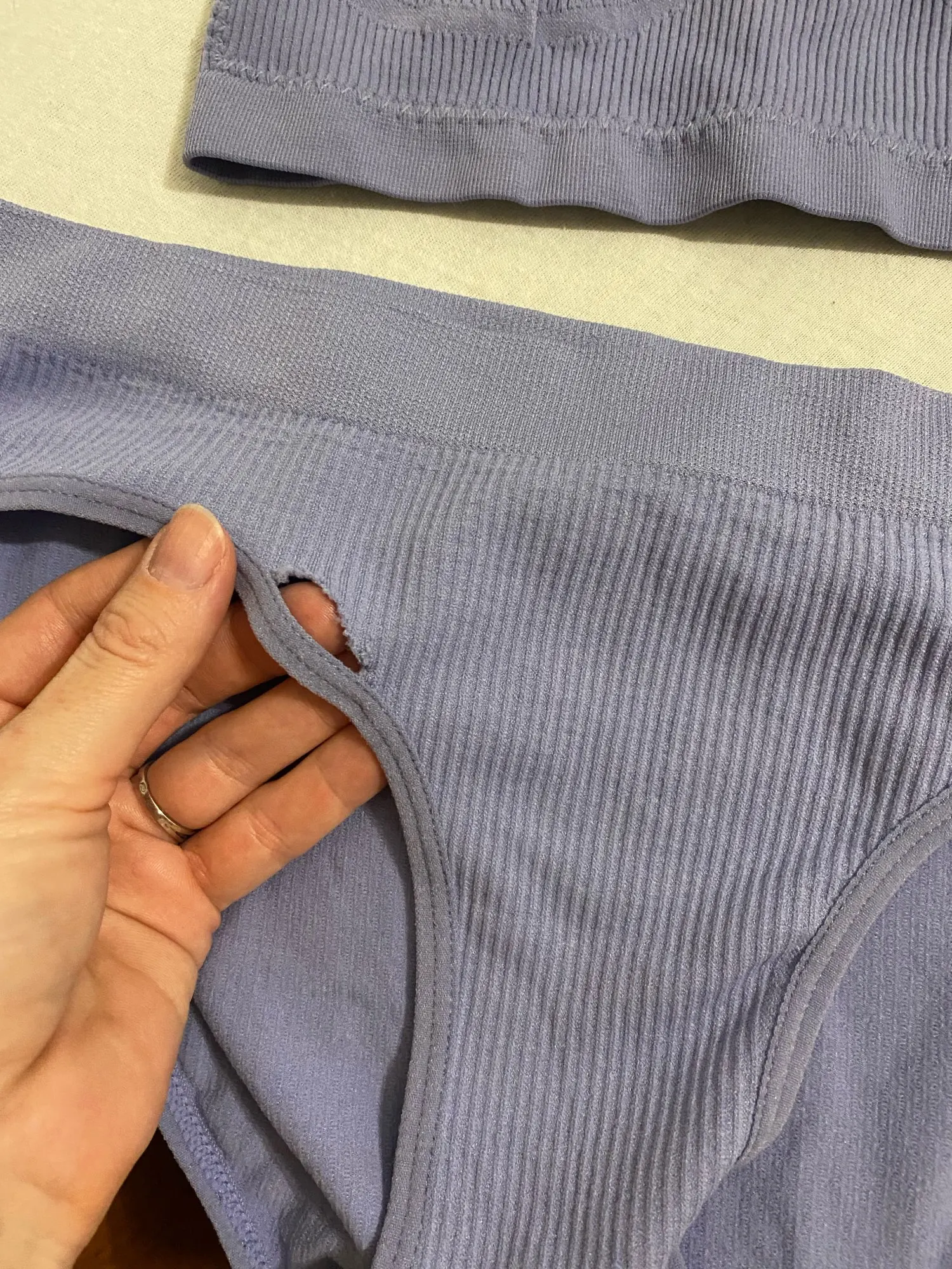Заказываю не в первый раз, доставка занимает ~7 дней. Очень удобные комплекты. В этот раз на темно сиреневом цвете косая бейка отличалась цветом от основного материала. Но думаю это мелочи жизни. С продавцом не общалась.