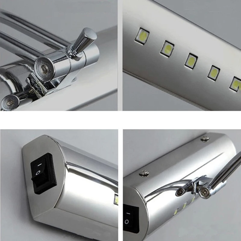 Спецификация: Тип: Светодиодный настенный зеркальный светильник Материал: нержавеющая сталь Количество: 1 шт. Цвет изделия: серебристый Светодиодный Дов: SMD 5050 Мощность: 5 Вт 7 Вт Цвет светильник теплый белый (3000-3500K) Холодный белый (6000-6500K) Диммируемый: нет Водонепроницаемость: Нет Вход: 85-265 В переменного тока Гц Срок службы: более 50000 часов Сертификация: CE/RoHS Размер элемента: 5 Вт 40 см; 7 Вт 55 см Комплектация: 1 * светодиодный настенный светильник 1 * набор аксессуаров