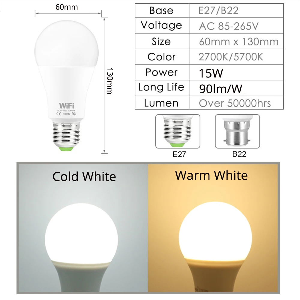 15W Smart WiFi светильник лампочка E27 B22 с регулируемой яркостью ...