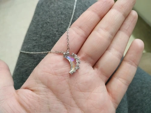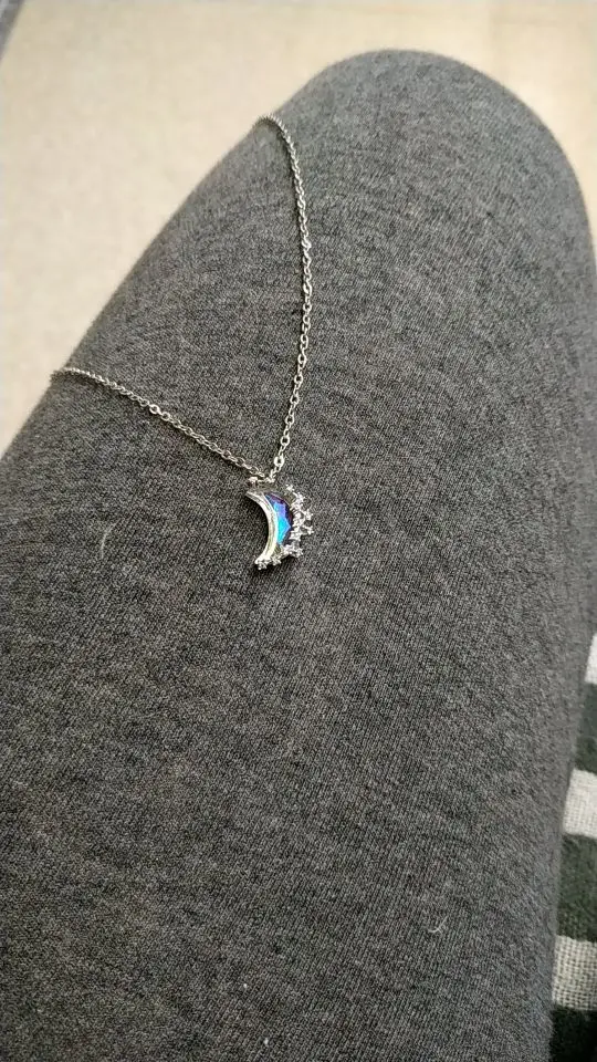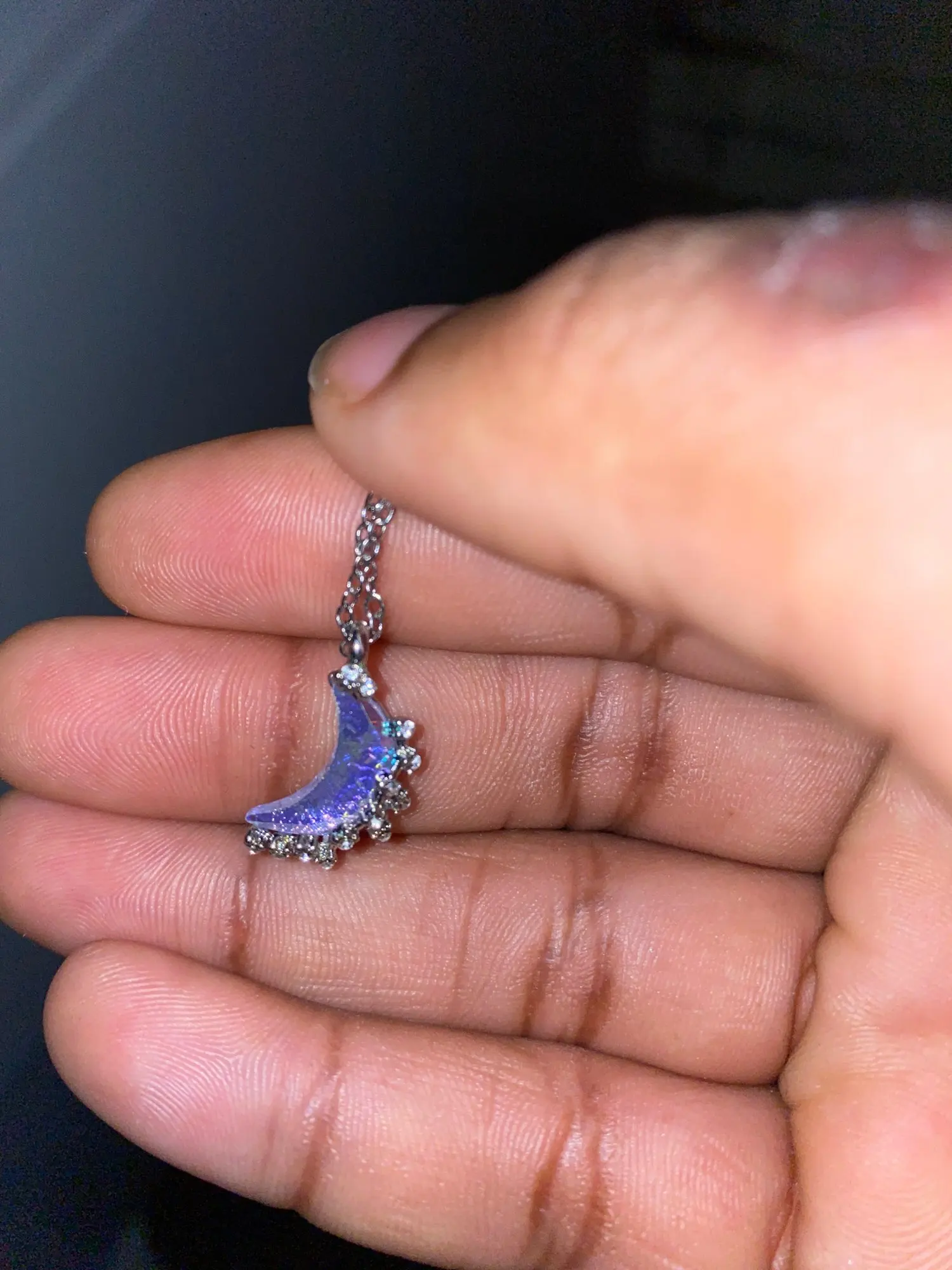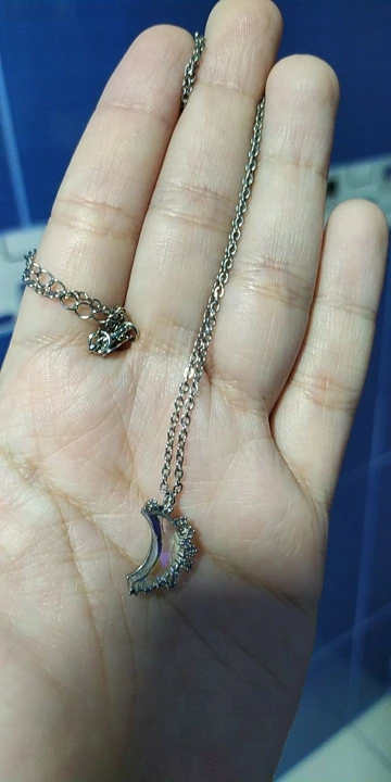 Красивый кулон. Длина цепочки составляет 46 см, кулон-приблизительно 1,5x2 см. При определенных условиях освещения создает впечатление свечения. Цвет наносится на переднюю поверхность пластика. Конечно, он не светится в темноте.