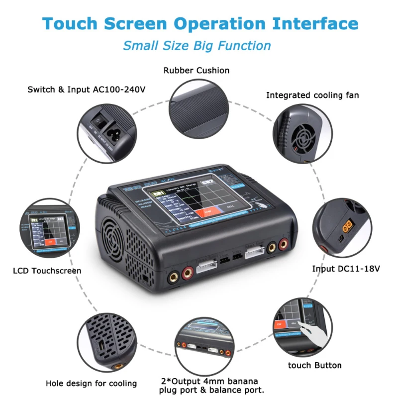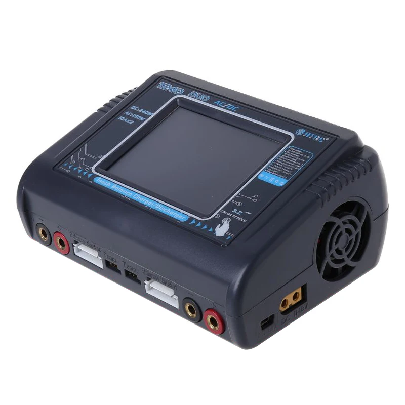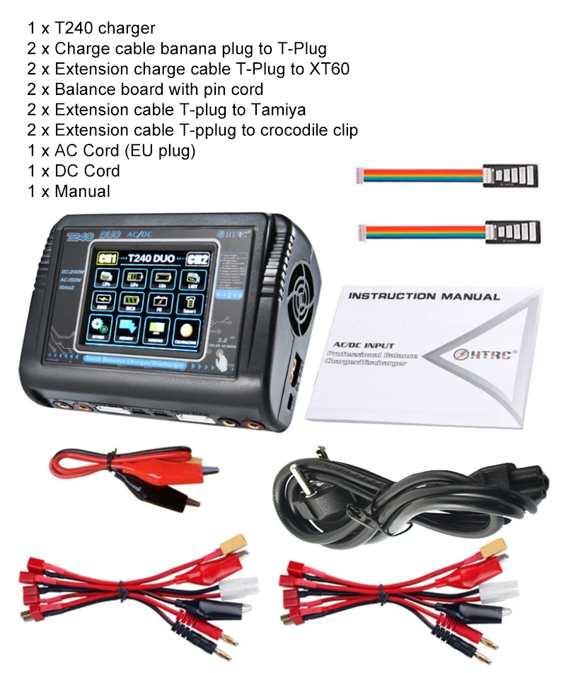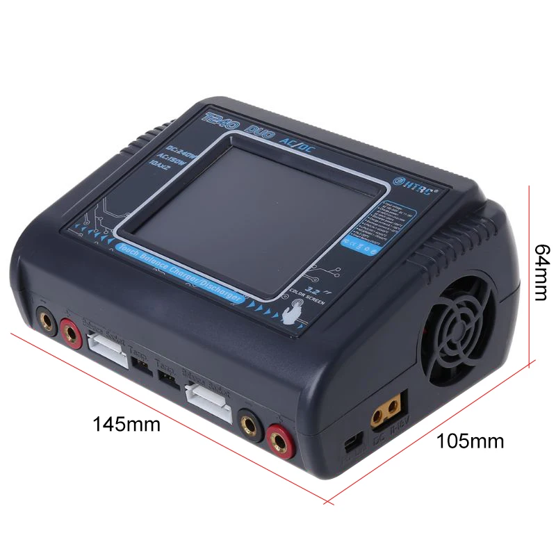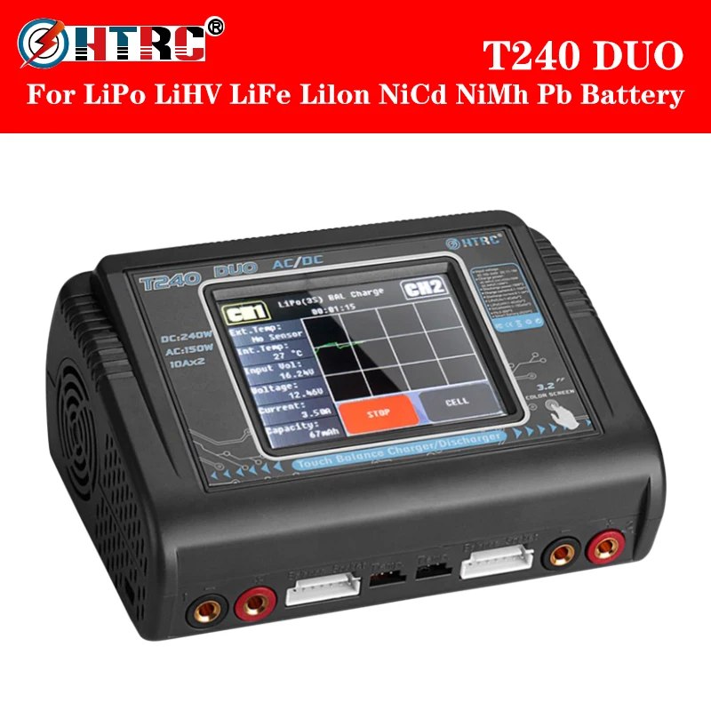 HTRC T240 DUO AC 150 Вт/DC 240 Вт двухканальный 10A RC зарядное устройство для LiPo LiHV LiFe Lilon NiCd NiMh Pb батареяОсобенности:1. Все пластиковый корпус, тонкий и компактный, 3,2 дюймовый цветной сенсорный экран.2. Высокая мощность, быстрая зарядка.3. Автоматическая идентификация количества батарей lipo.4. Поддержка высоковольтного аккумулятора LiHV.5. Поддержка регулируемой цифровой выходной мощности.6. Обнаружение внутреннего сопротивления.7. С вентилятором, быстрое рассеивание тепла.Описание:Многофункциональный, высокая мощность, использование 3,2 дюйма цвет ЖК-дисплей Toch экран дисплея, легкая работа, встроенный вентилятор охлаждения, DC 11-18V или AC 100-240 В двойная мощность. T240 DUO предназначен для зарядки аккумуляторов LiPo LiFe Lilon LiHV NiCd NiMh Pb Smart.