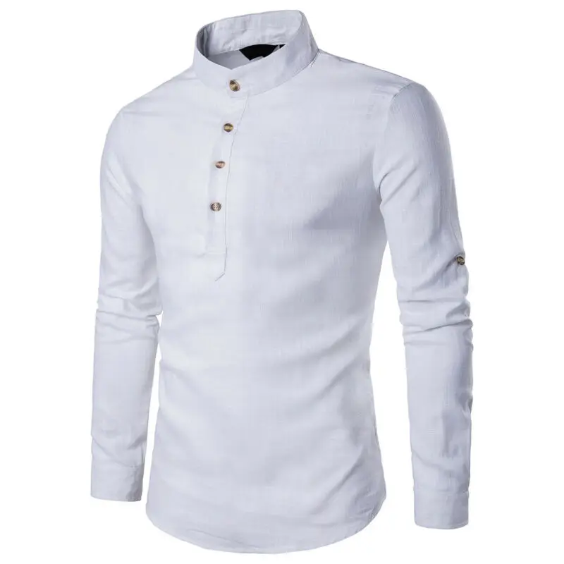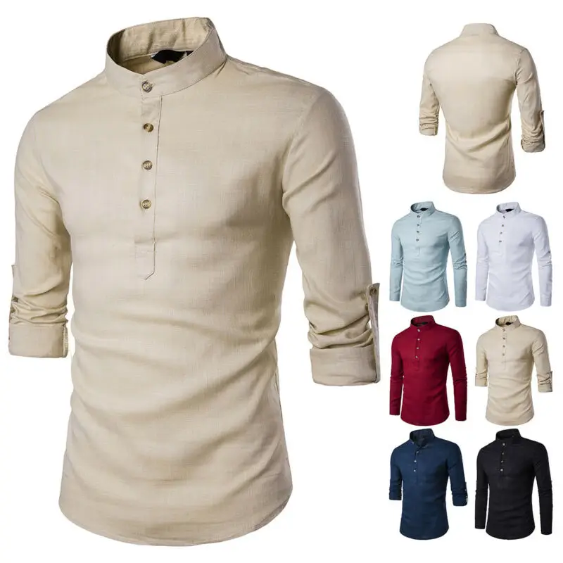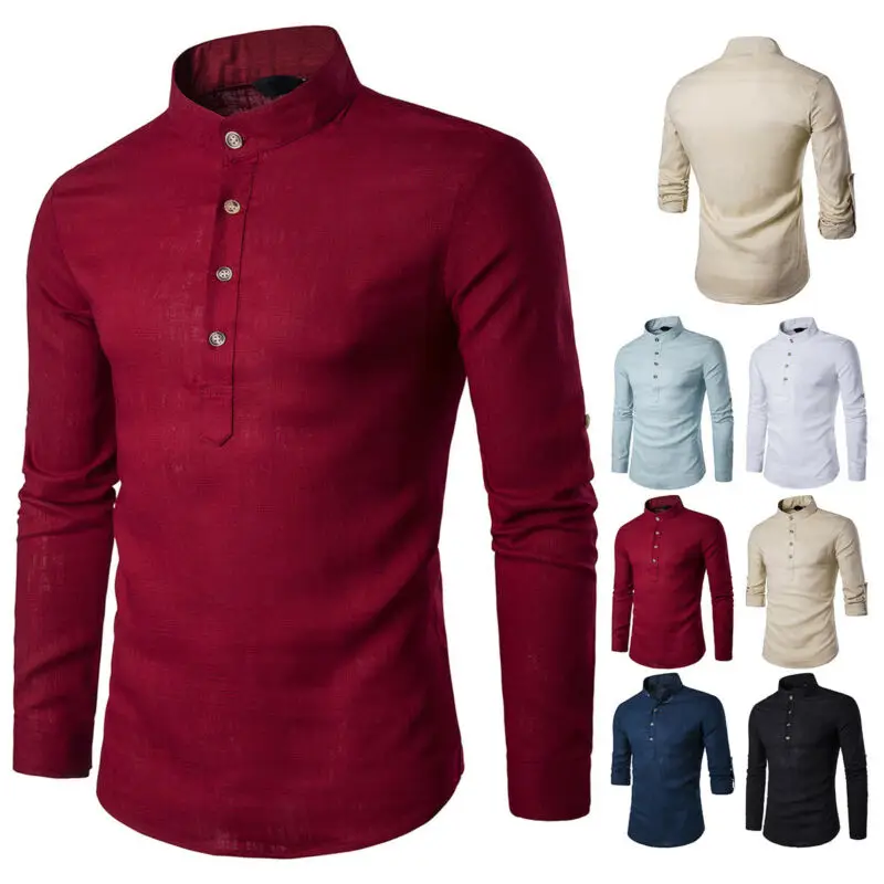 Мужская Повседневная рубашка, топы, стоячий воротник, хлопок, тонкая посадка, длинный рукав, чистый цвет, лен, модная, простая, универсальная, 2020, горячая новинка