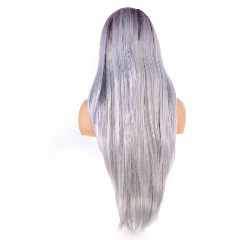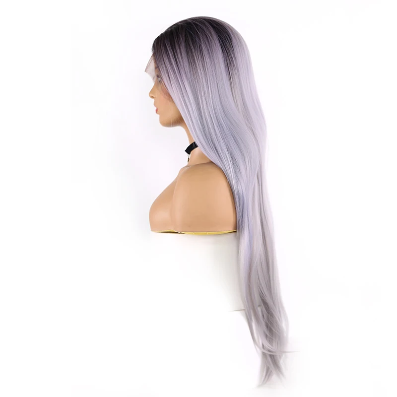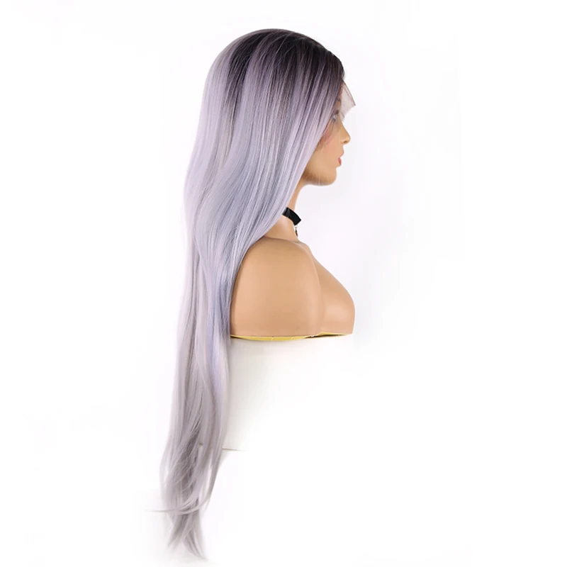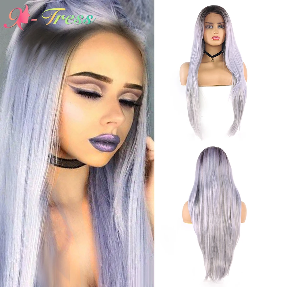 X-TRESS синтетические парики с детскими волосами Синтетические волосы на кружеве парик для Для женщин темные корни эффектом деграде (переход от темного к фиолетовый Серый цвет прямой парик шнурка Бесплатная часть