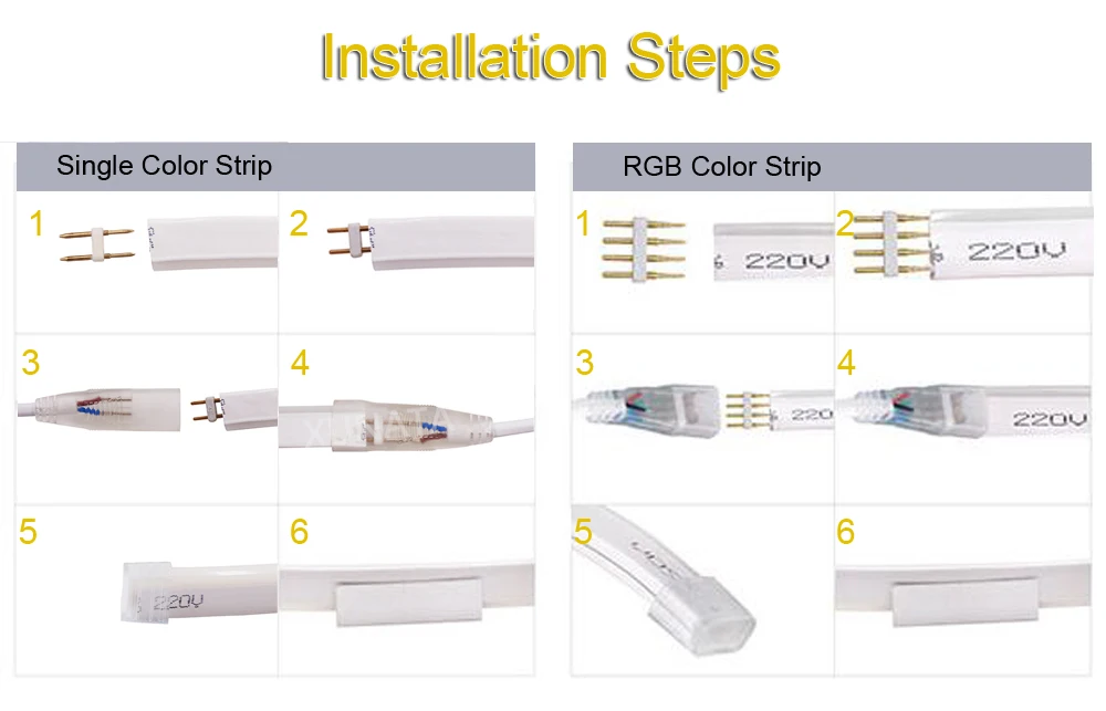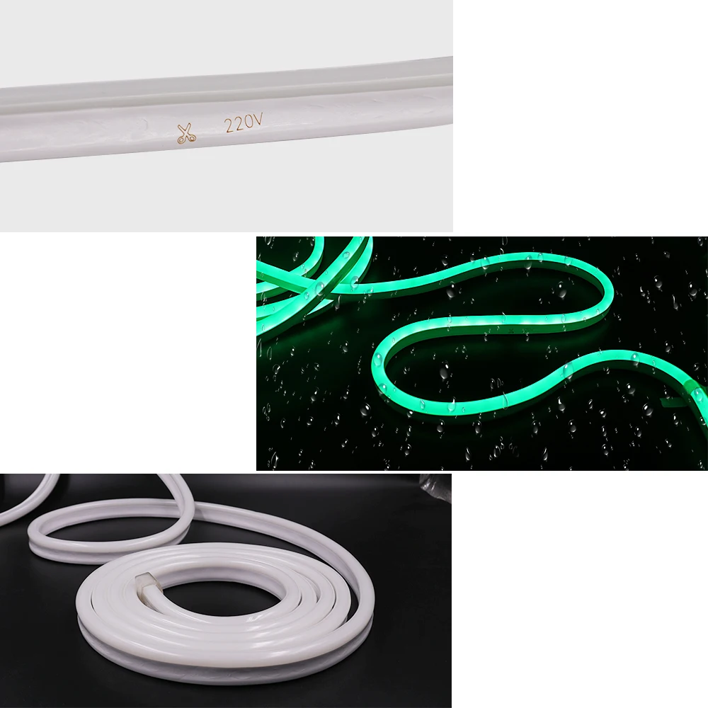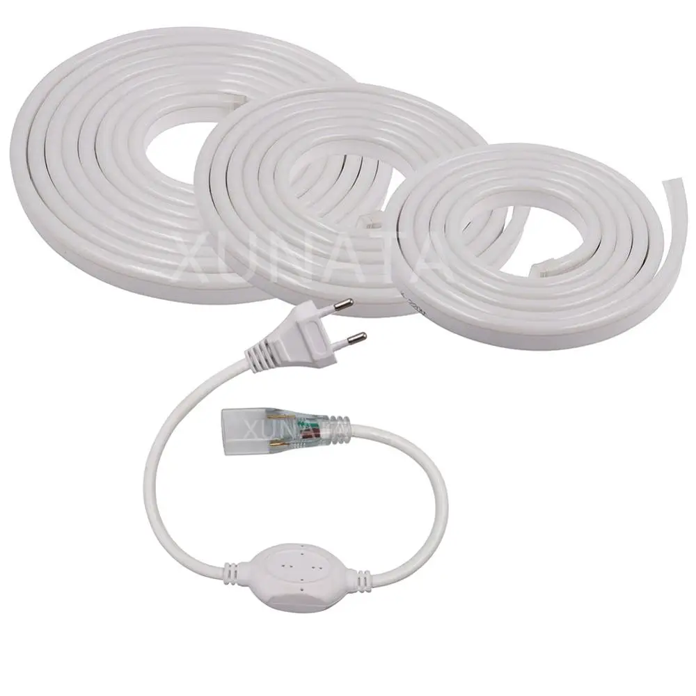 Светодиодная неоновая лента с вилкой питания европейского стандарта + 1 шт. 2-контактный медный контактный разъем + некоторые алюминиевые зажимы (без пульта дистанционного управления и RGB контроллера, каждая лента длиной 1 м поставляется с 1 шт. клипсами бесплатно) + 1 Торцевая крышка
