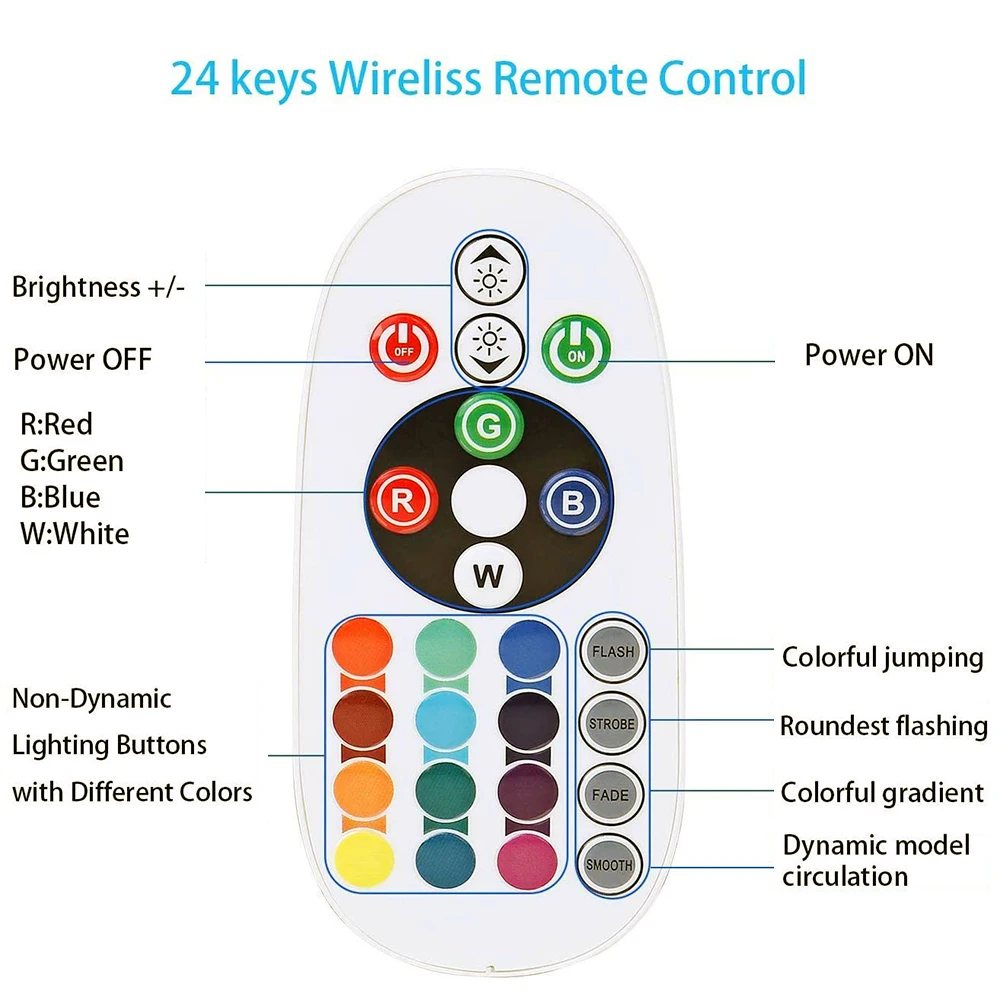 2.Режим освещения может управляться с помощью приложения для смартфона или статического цвета и динамического режима 3. Световую ленту можно управлять с помощью инфракрасного пульта дистанционного управления с 24 кнопками, регулировать яркость светящейся полосы.